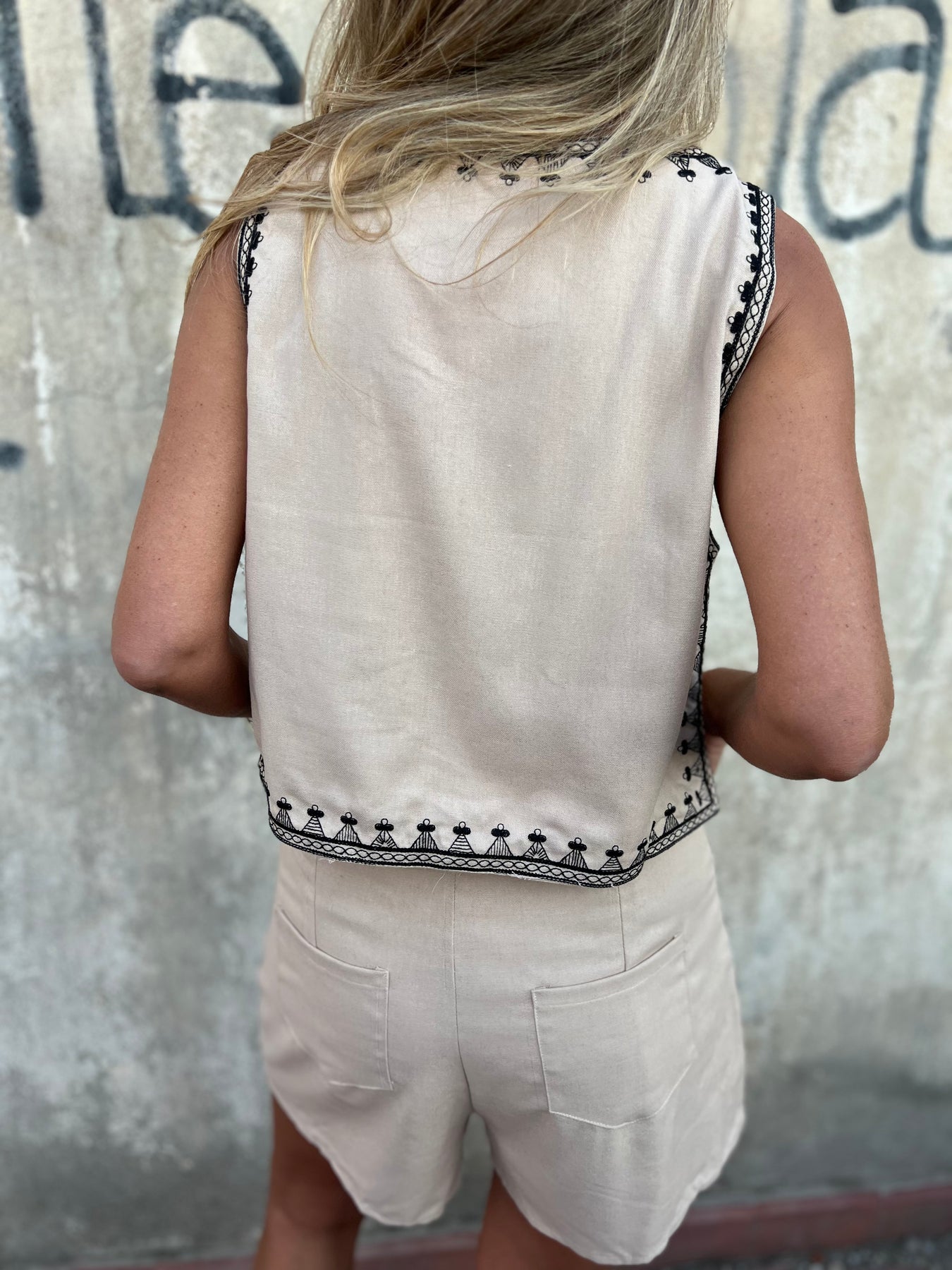 Conjunto de short y chaqueta de linoto con bordados.