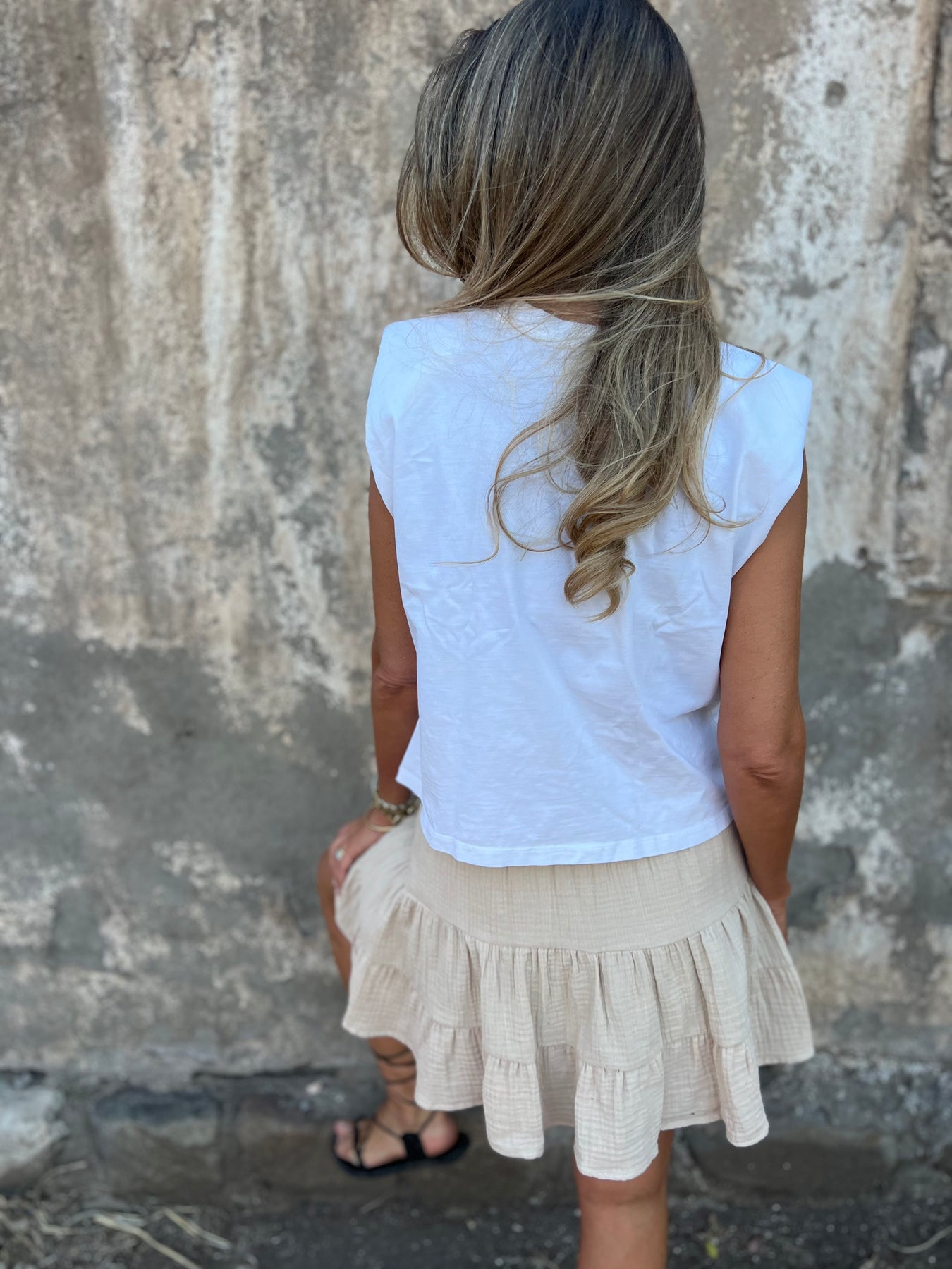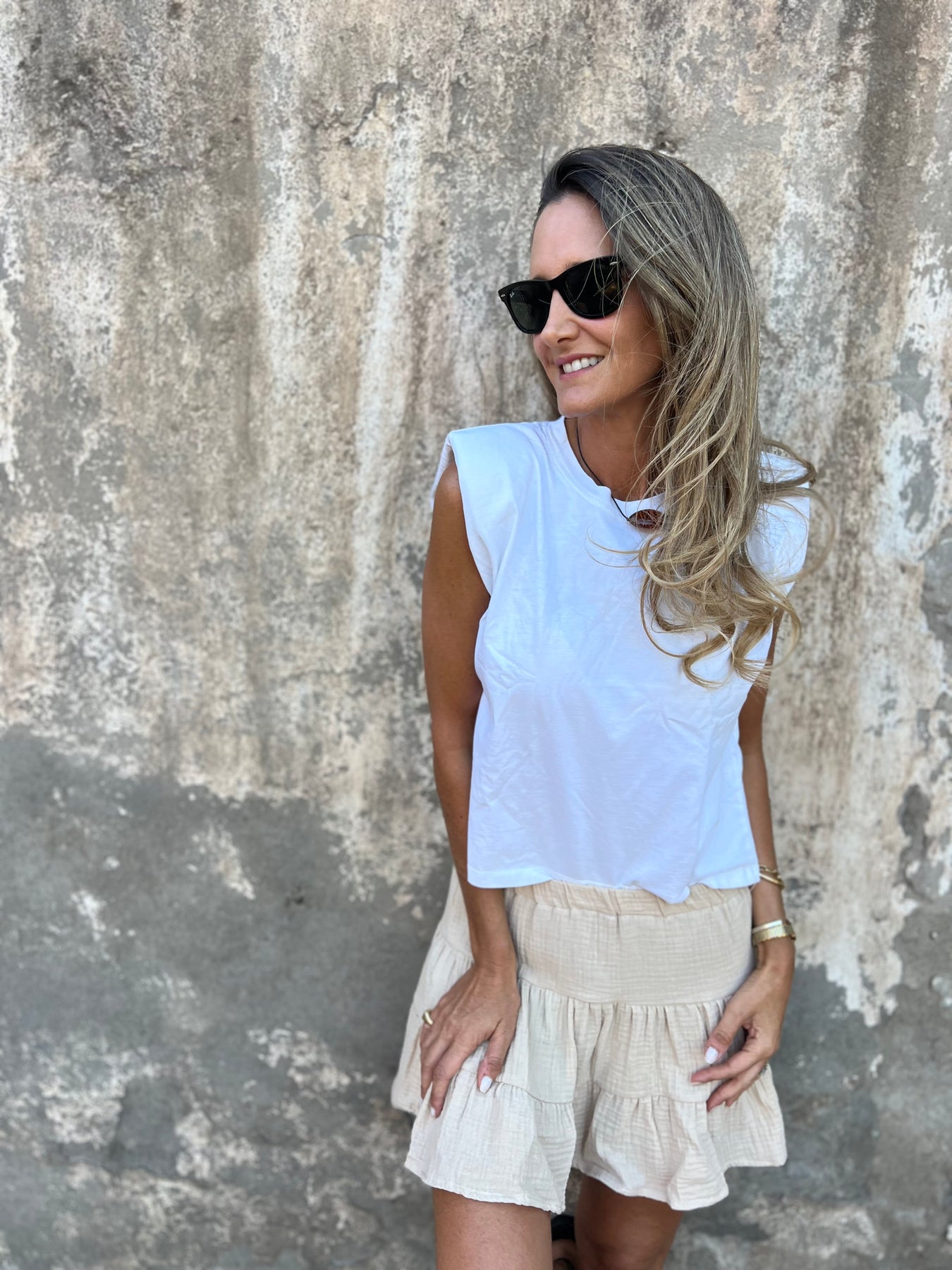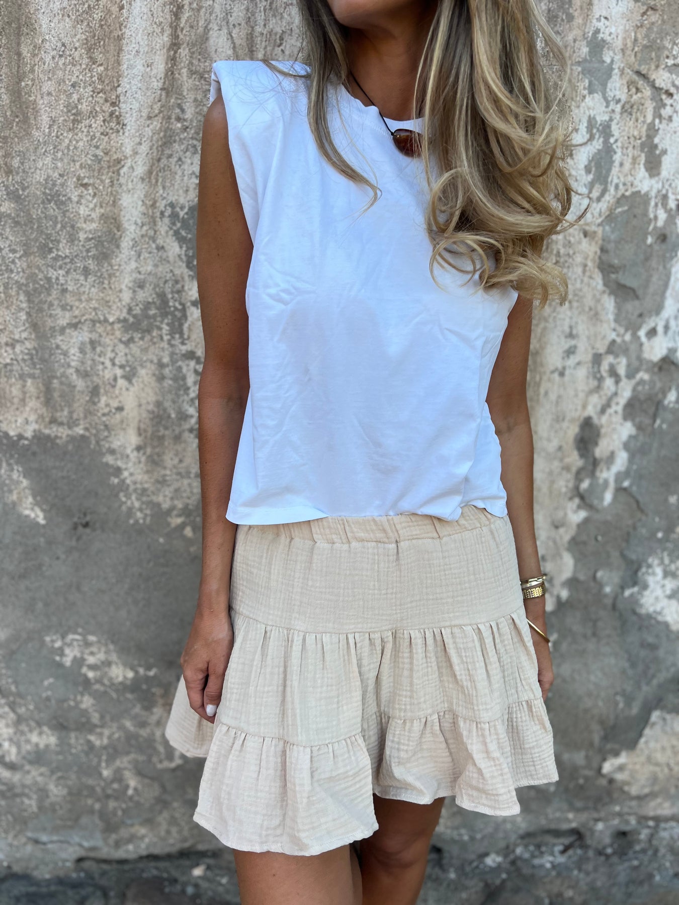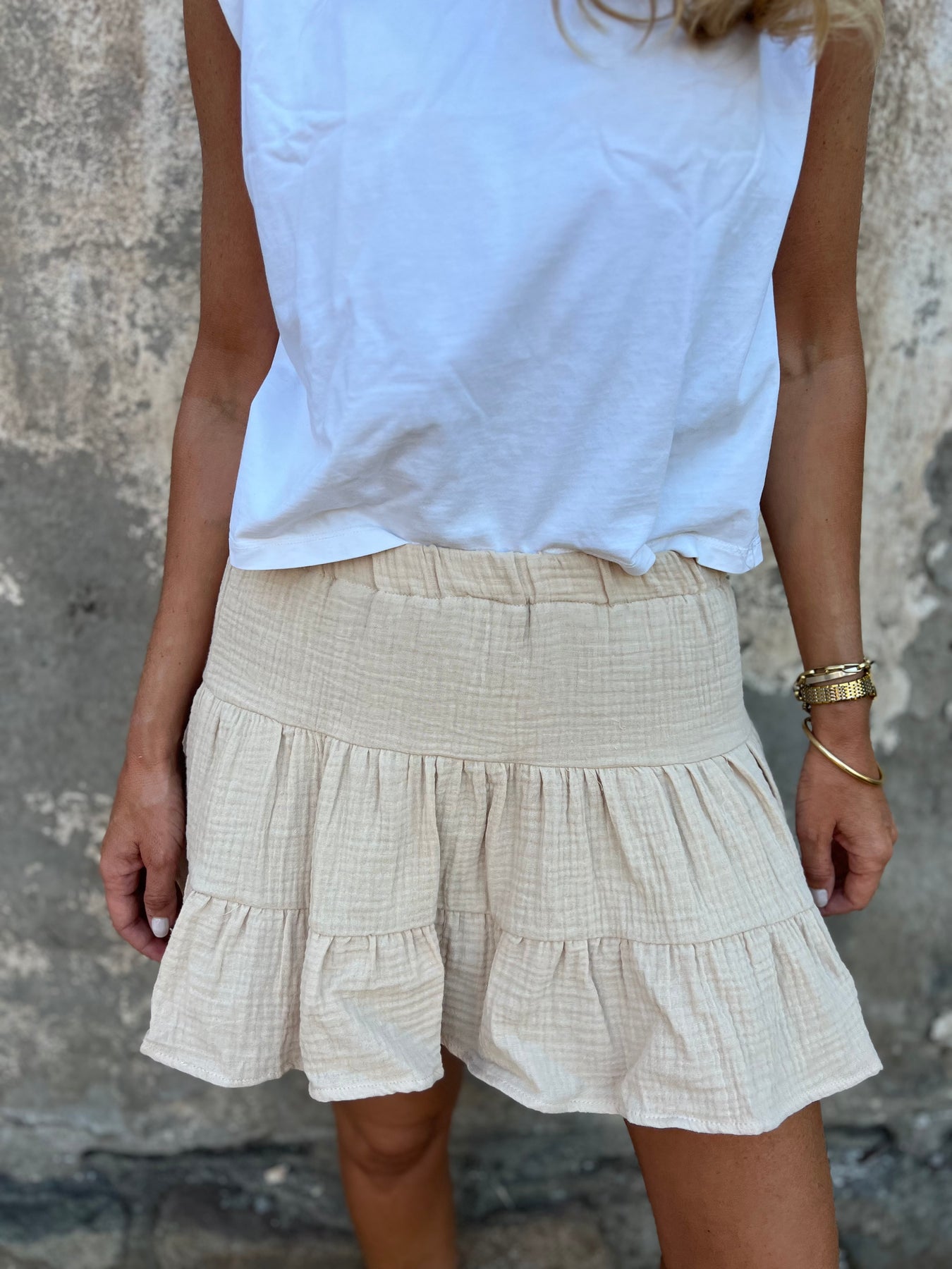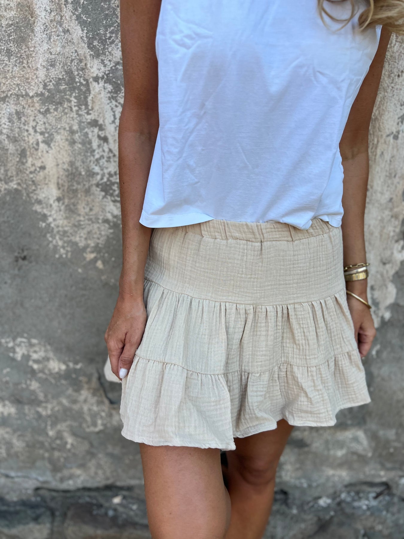 Pollera de muselina. Tiene cintura elasticada y es short y pollera a la vez