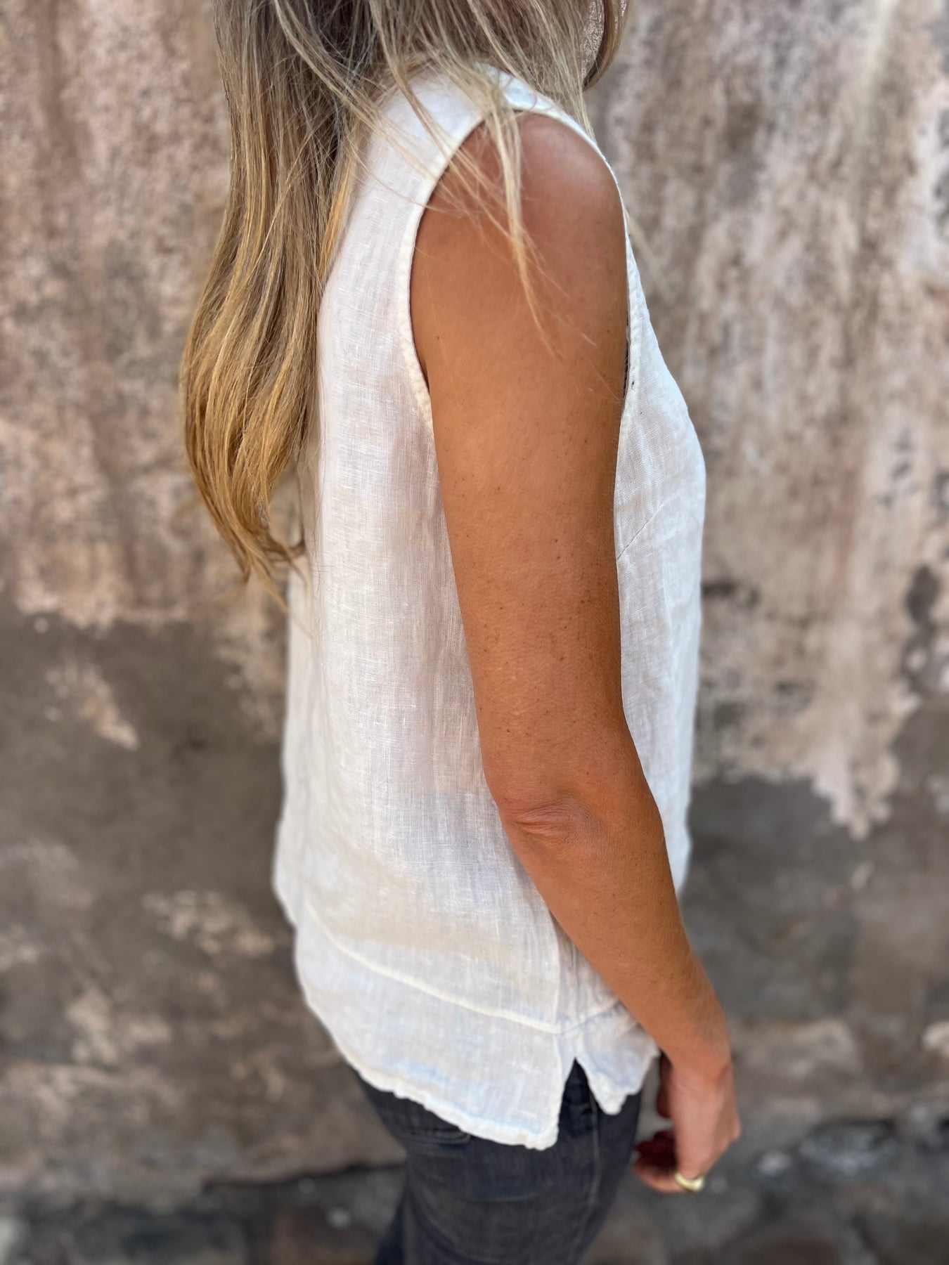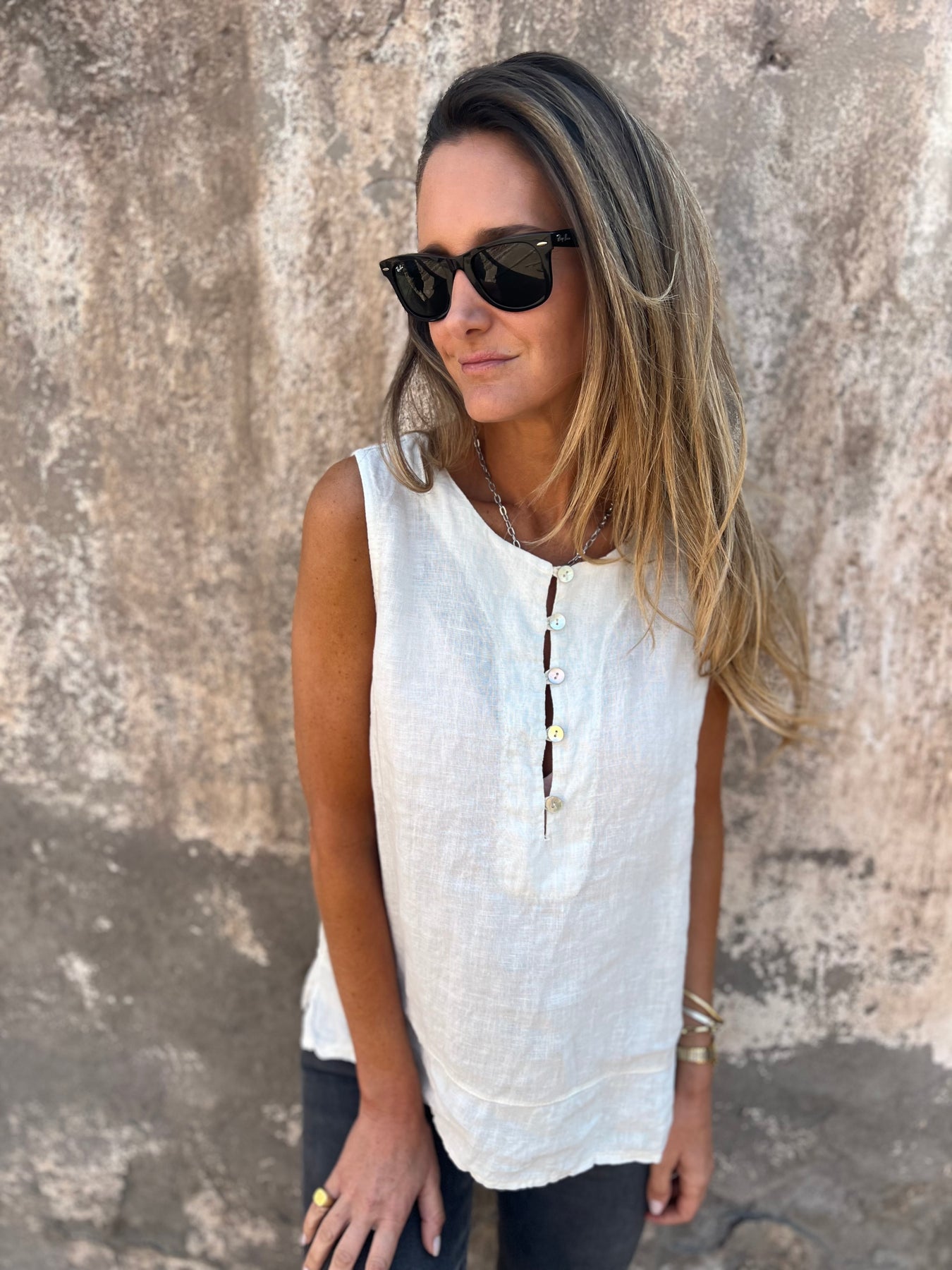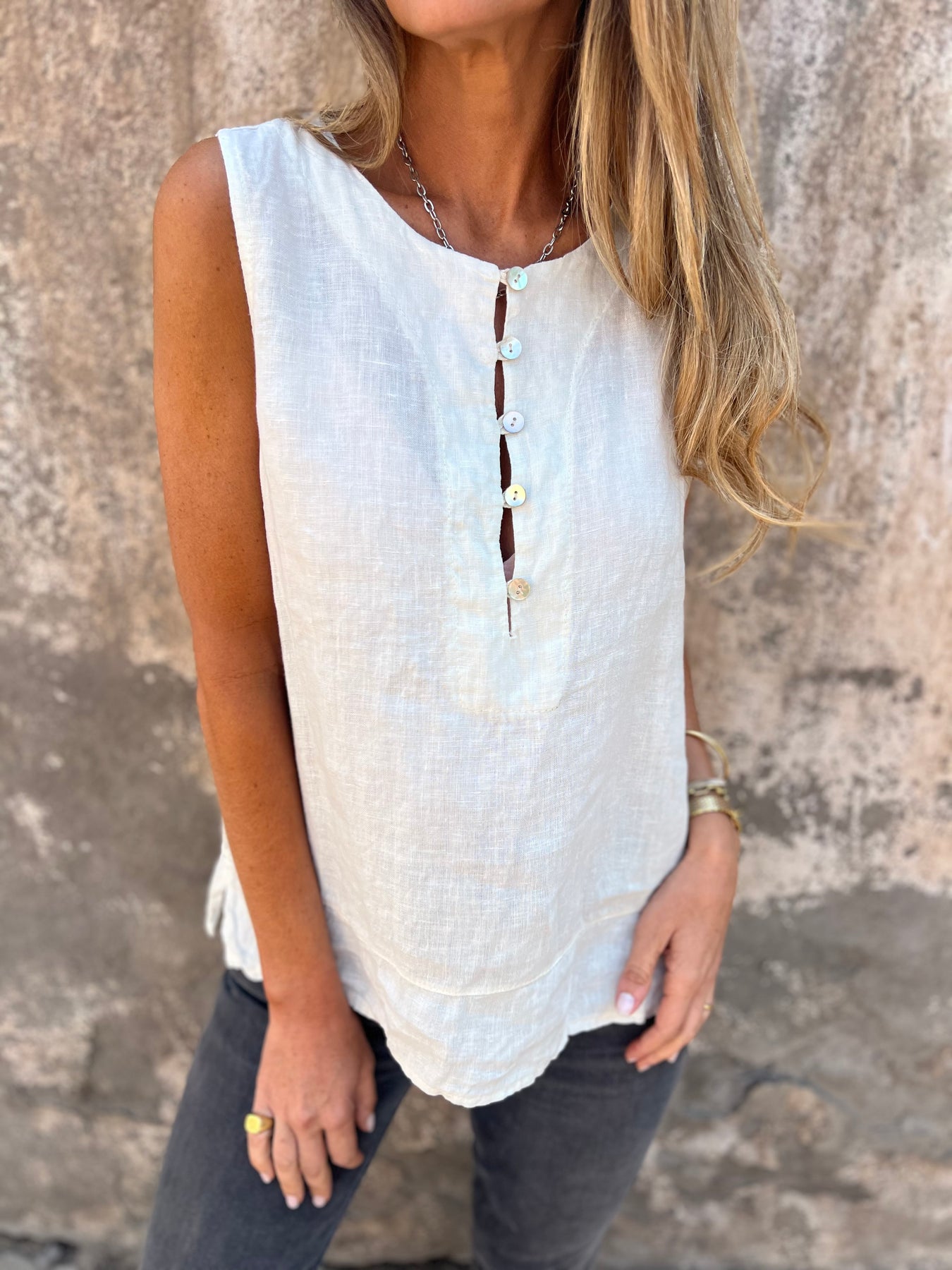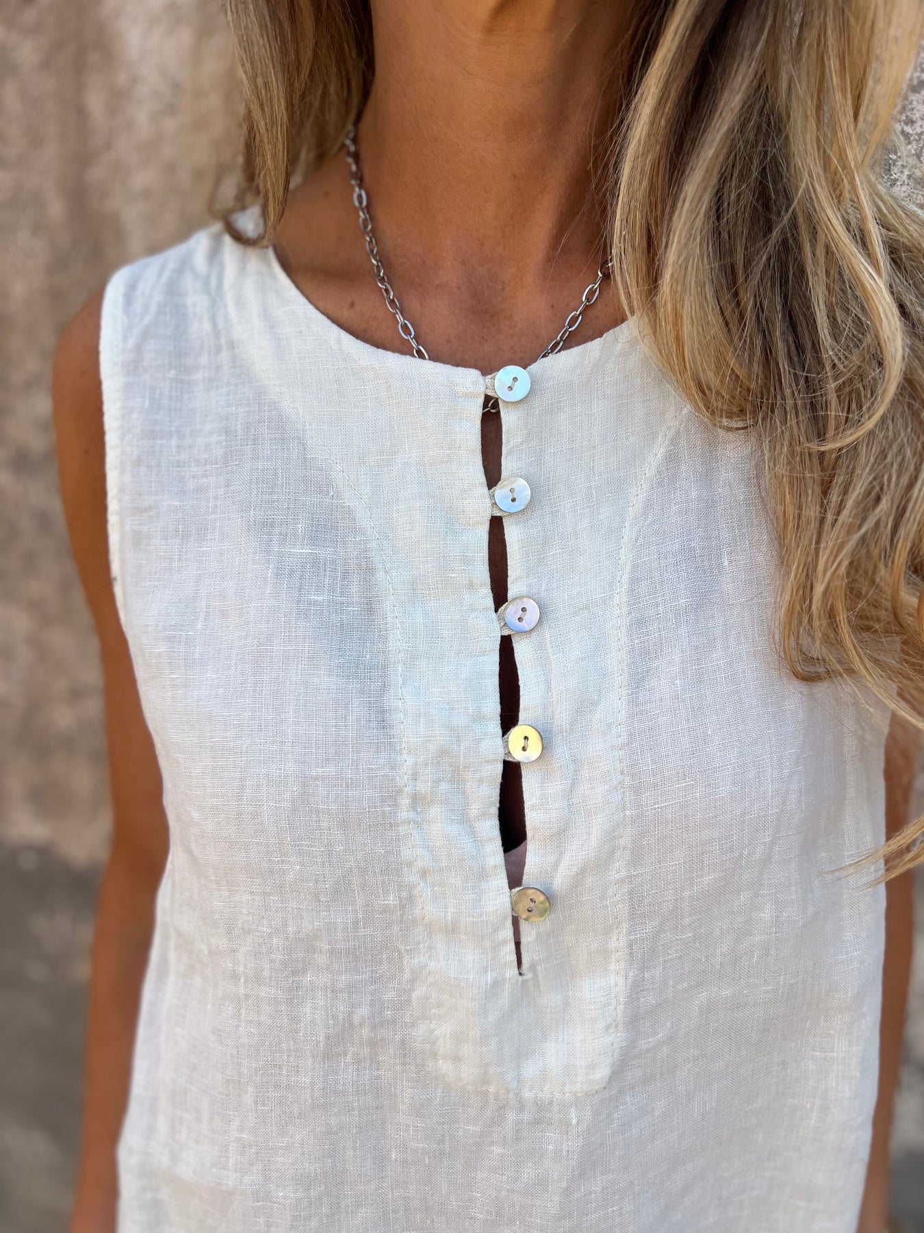 Blusa de lino italiano con botones de concha perla.