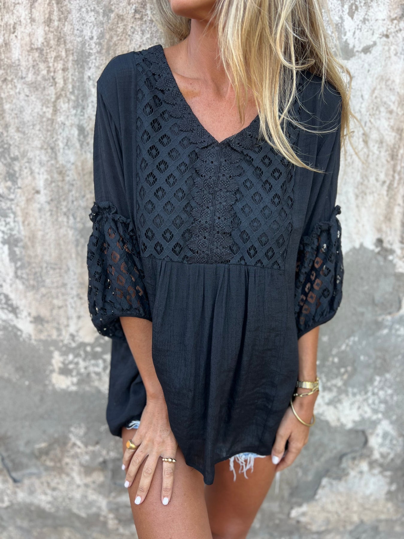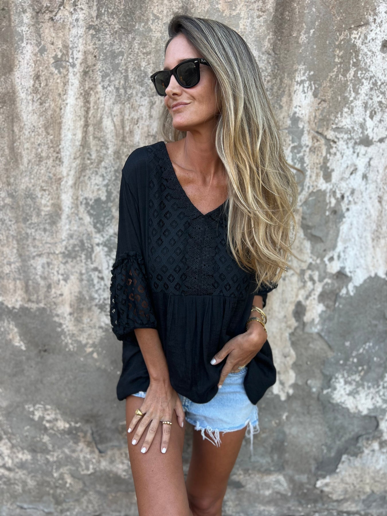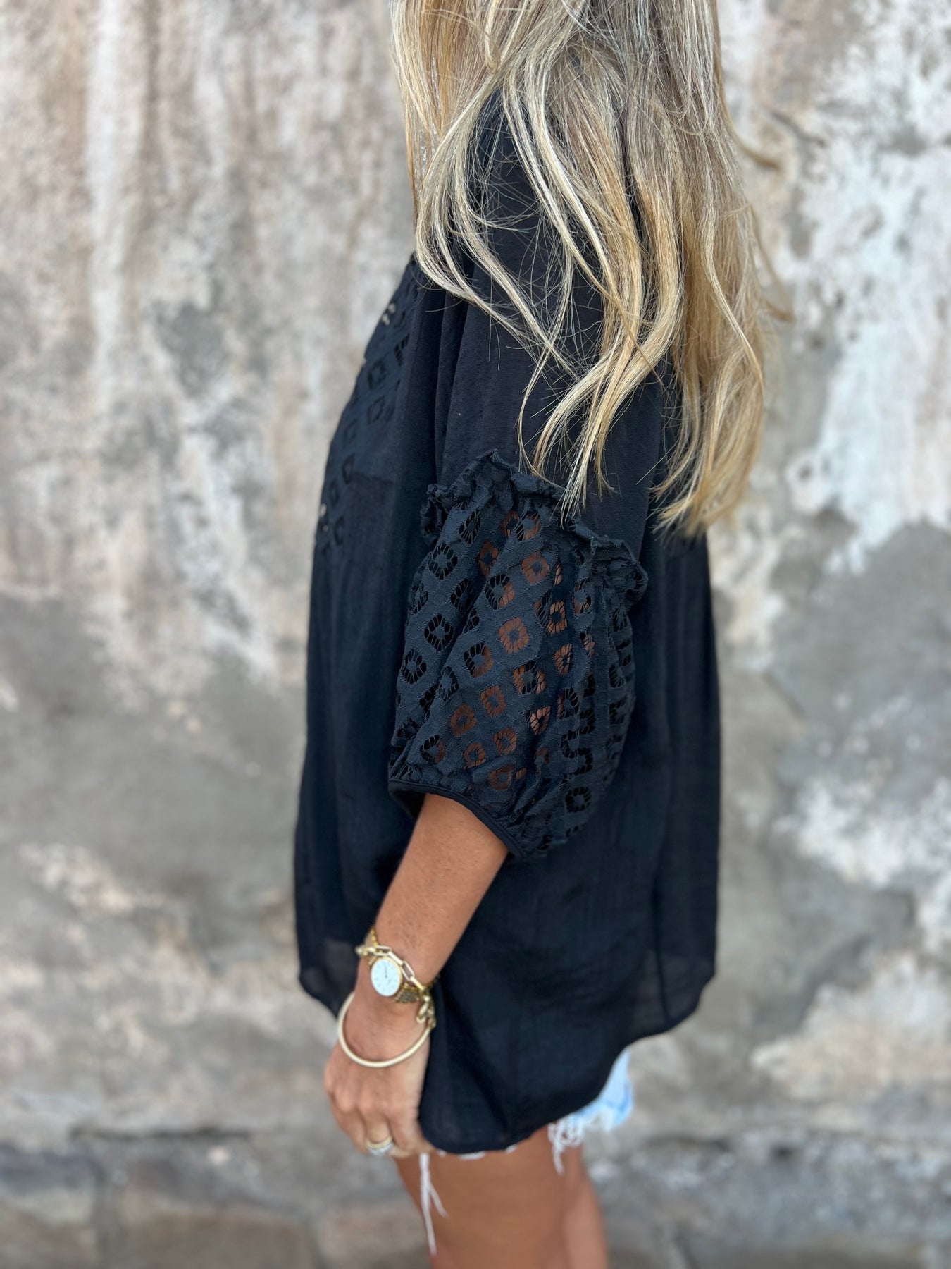 Blusa de linoto rústico con escote de macramé  y bordados. Manga globo.