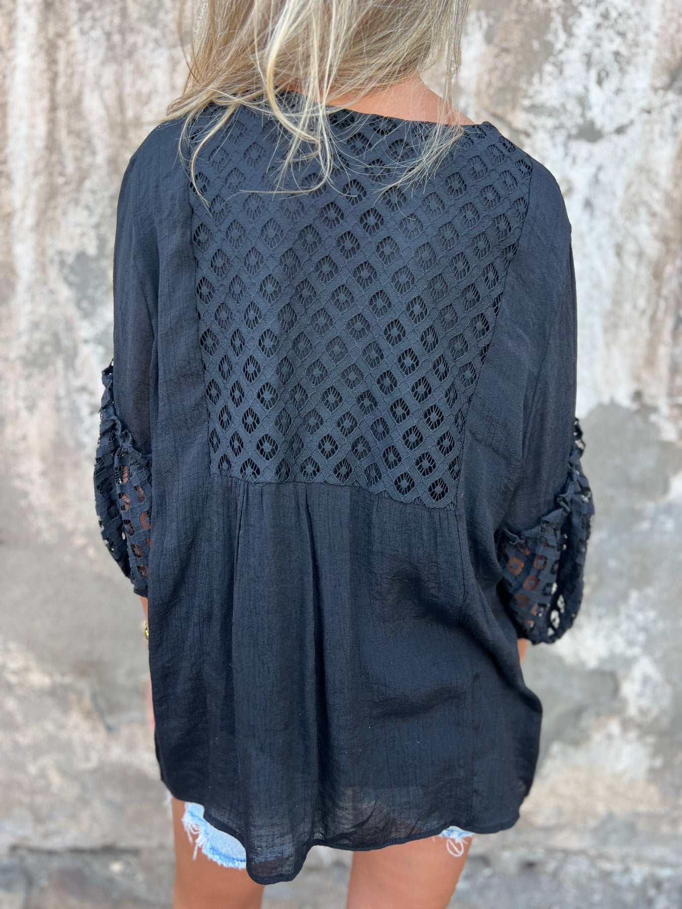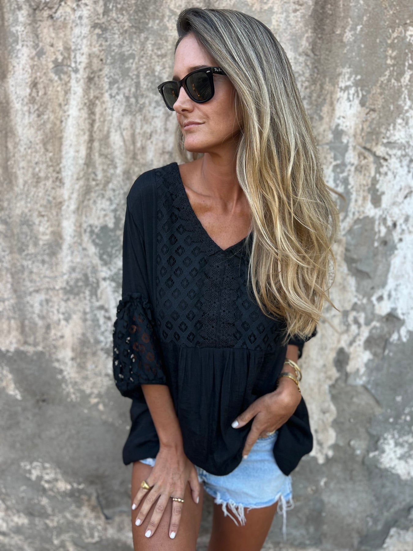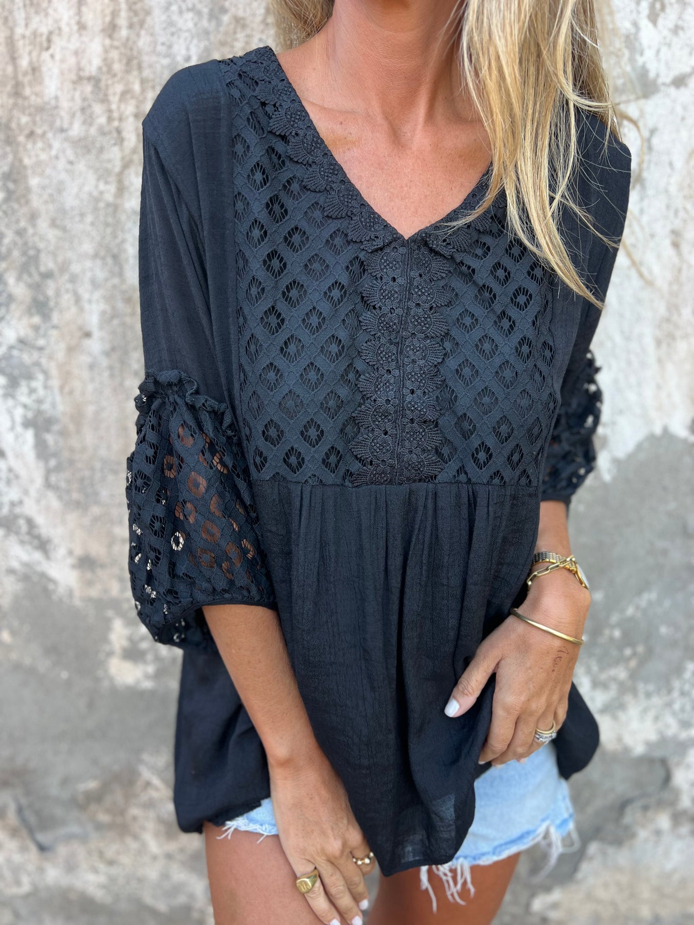 Blusa de linoto rústico con escote de macramé  y bordados. Manga globo.