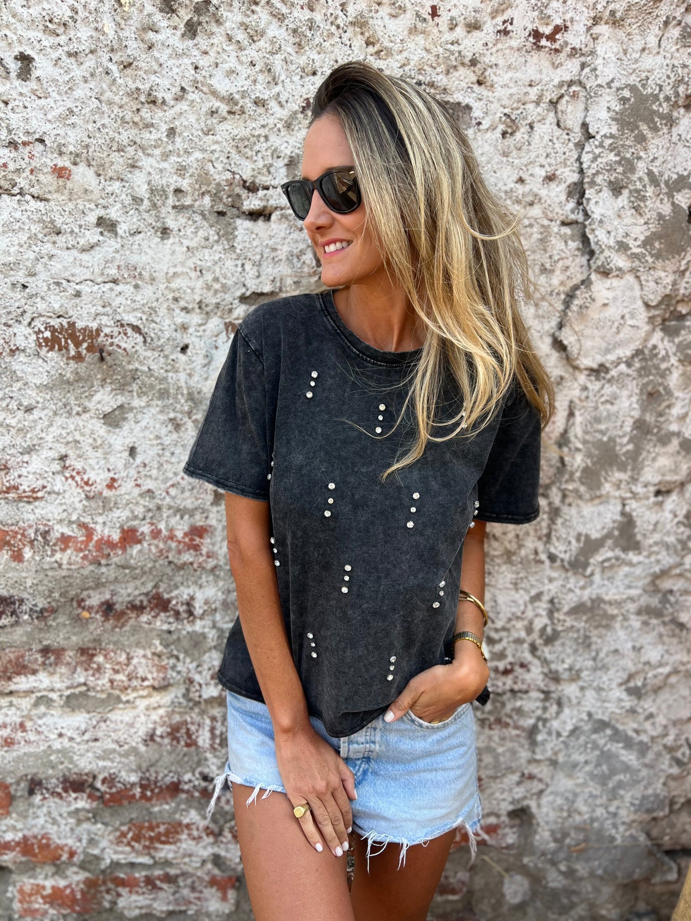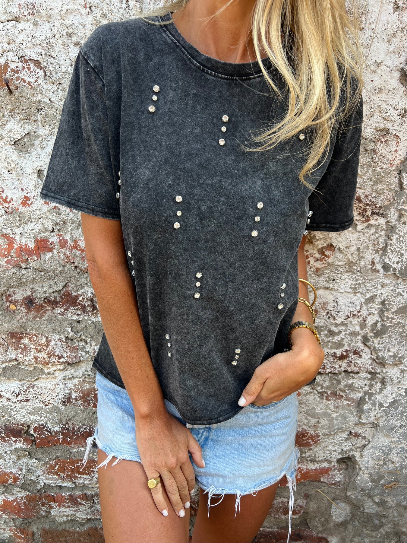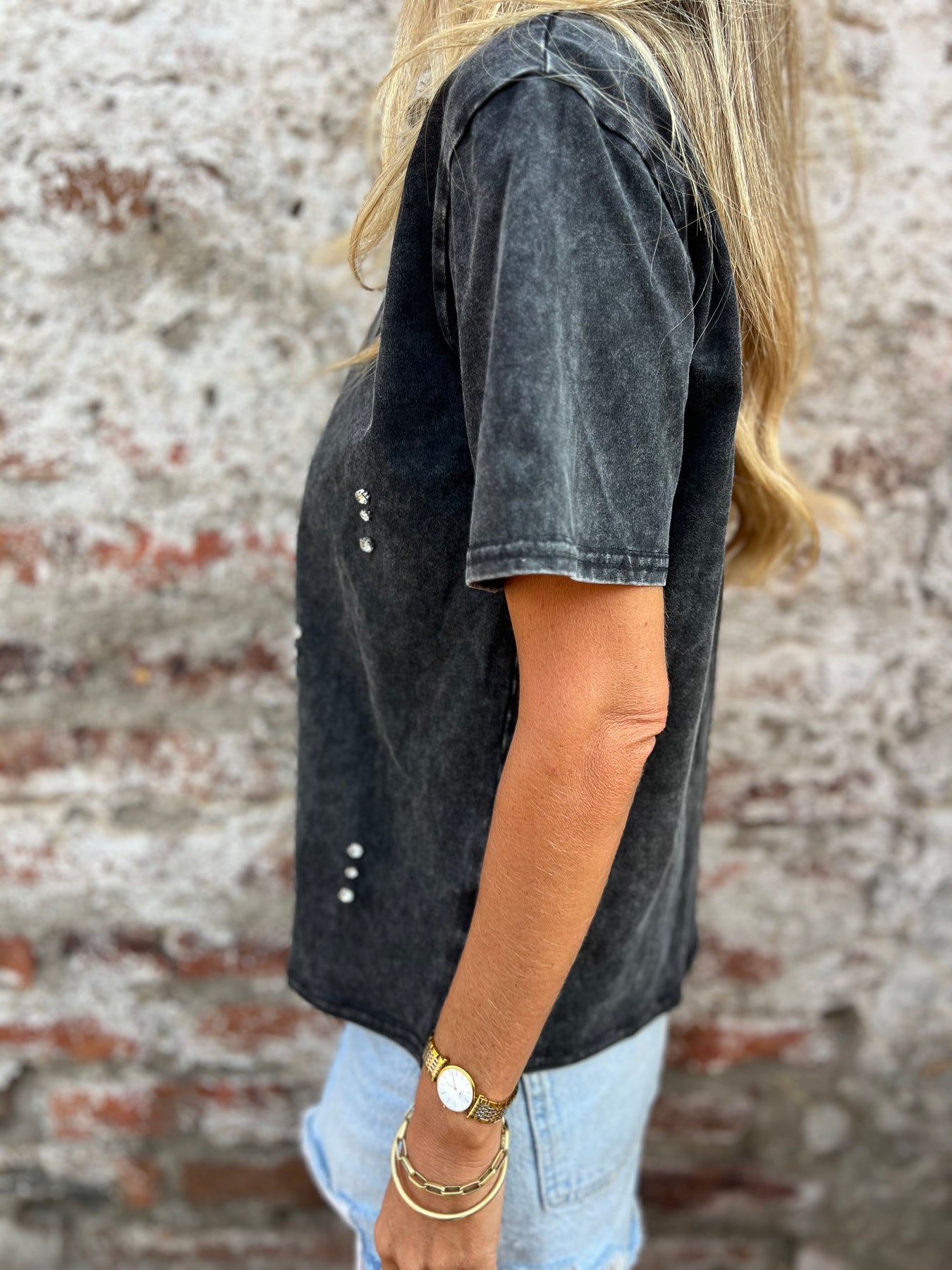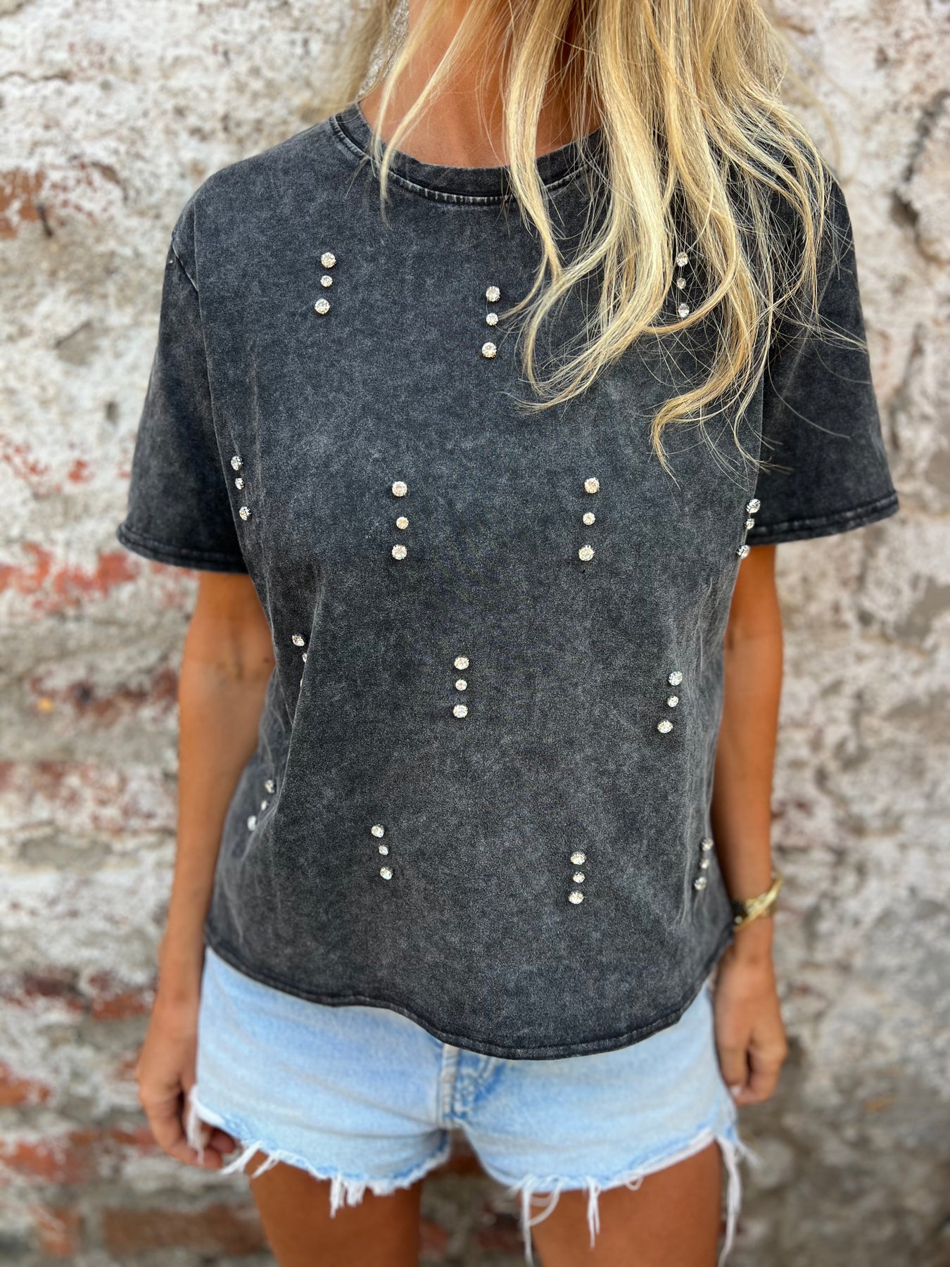 Polera de algodón elasticada con detalle de brillantes