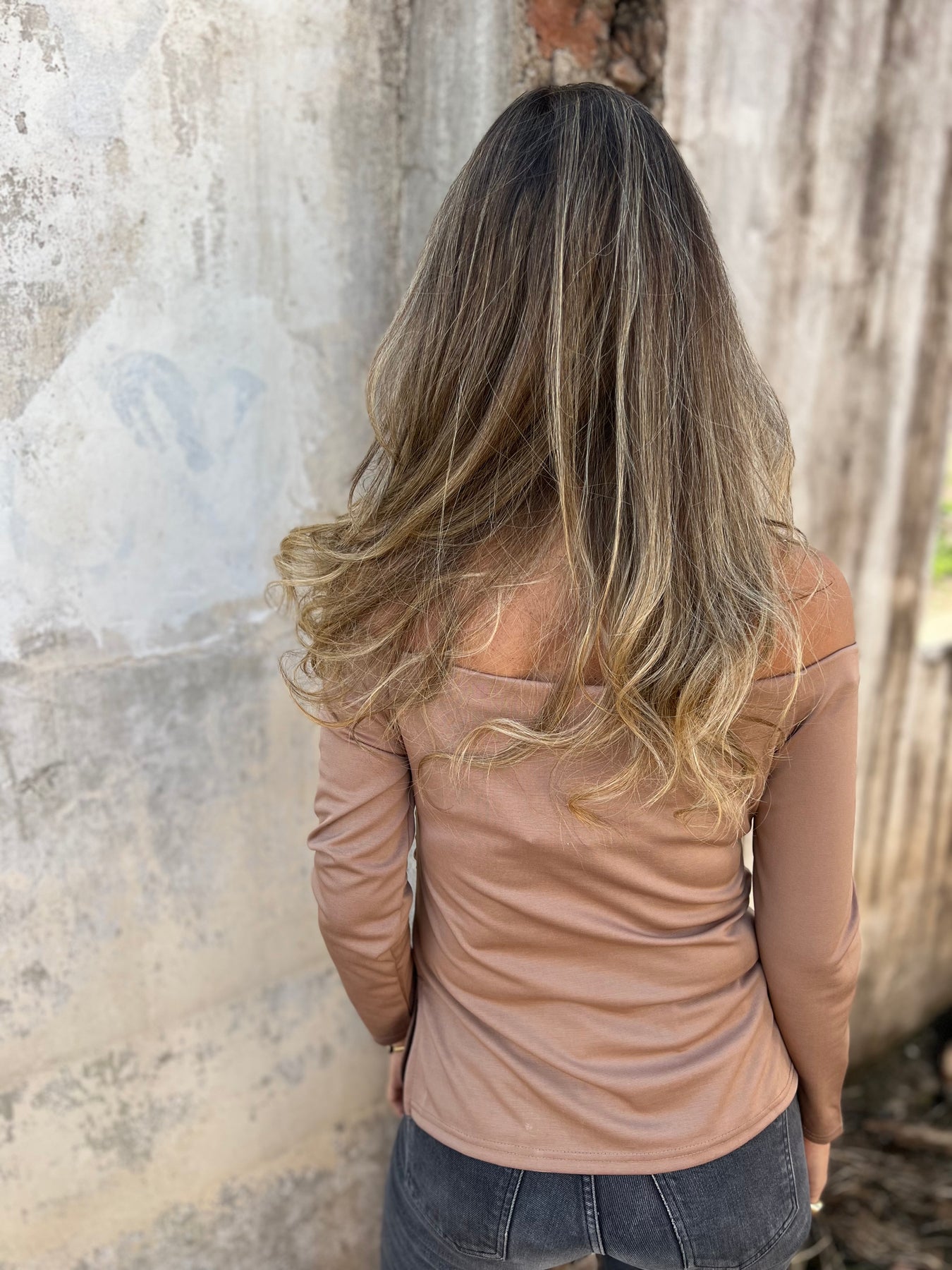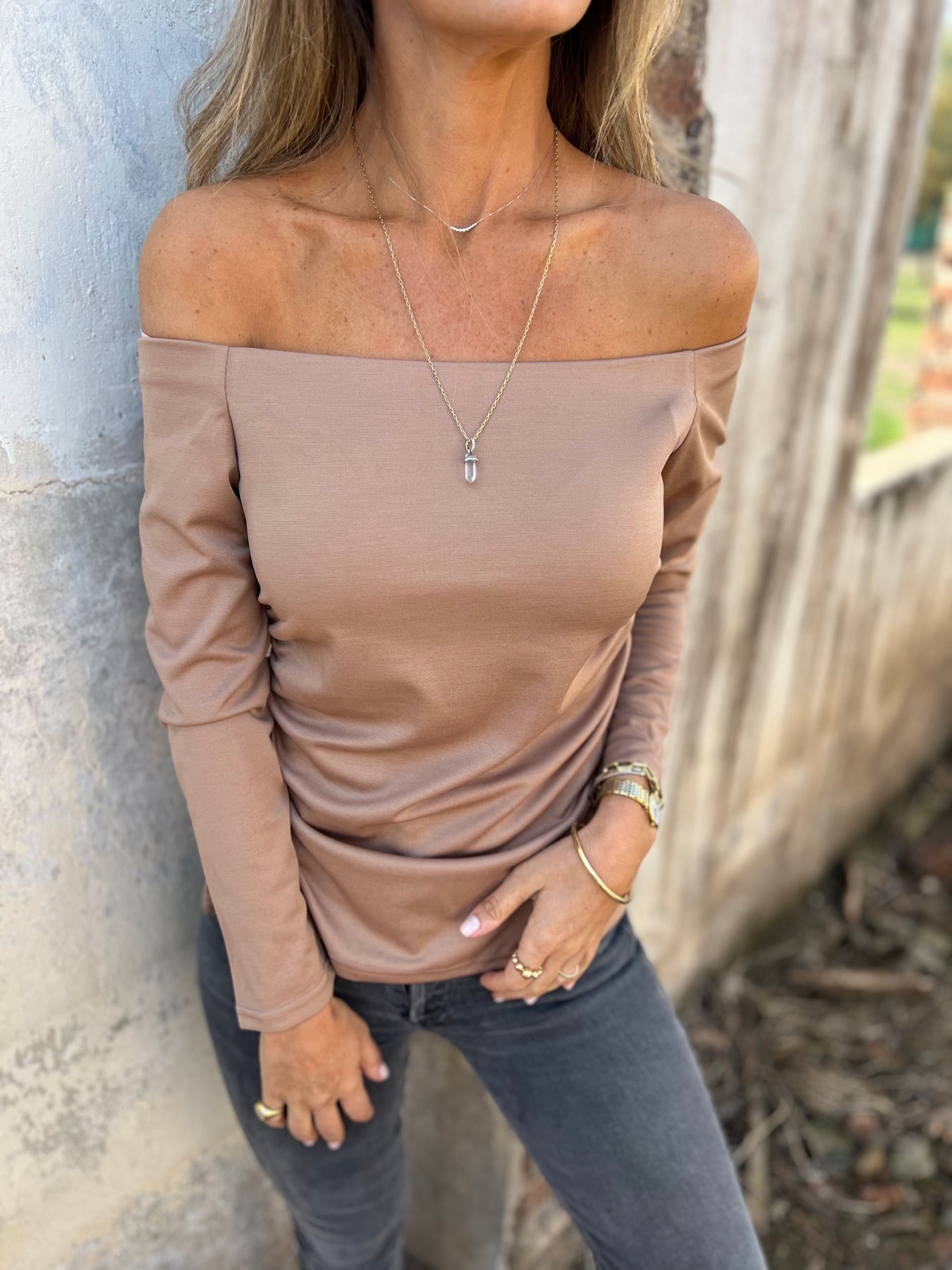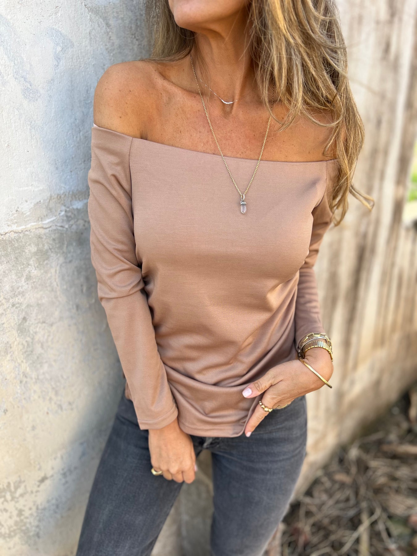 Polera sin hombro camel