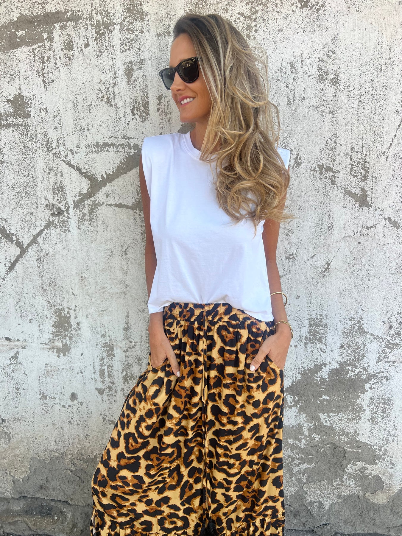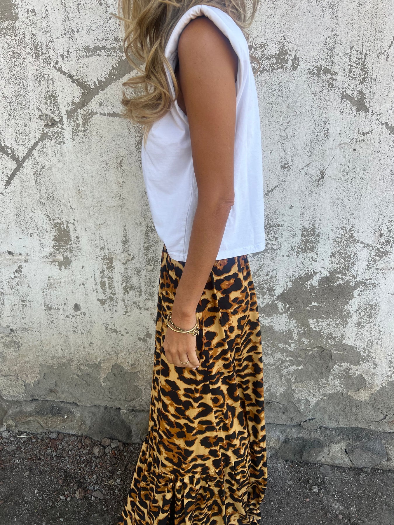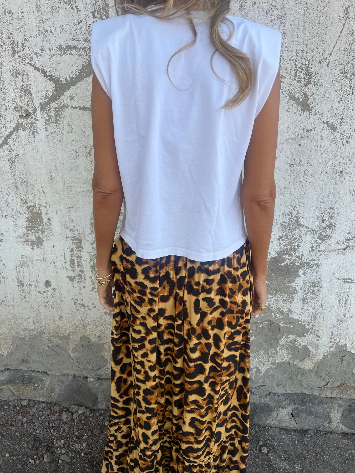 Pollera de viscosa con cintura elasticada.
