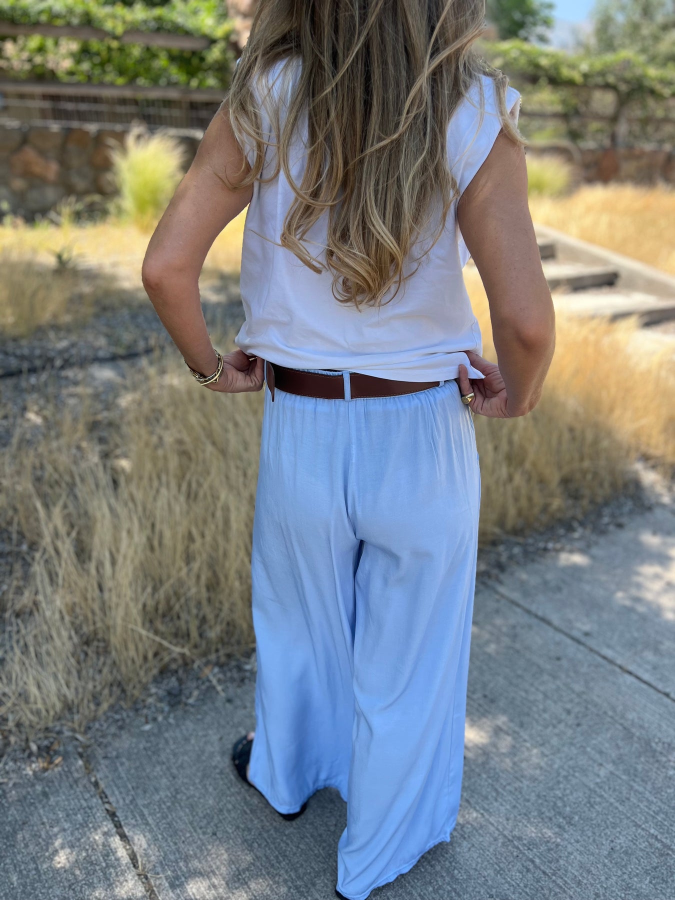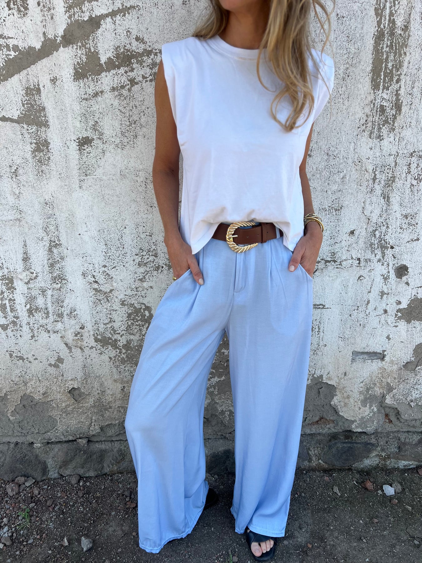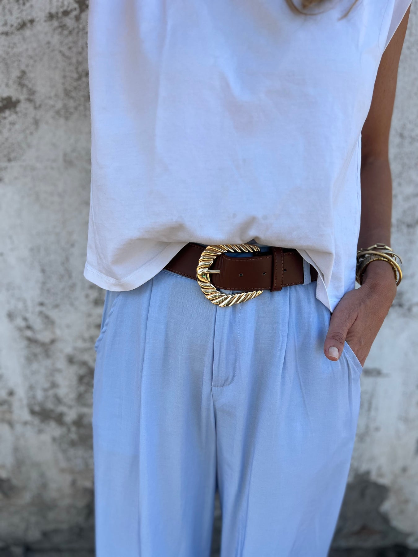 Pantalón de tencel. Incluye cinturón de ecocuero. Efecto semi tornasol.