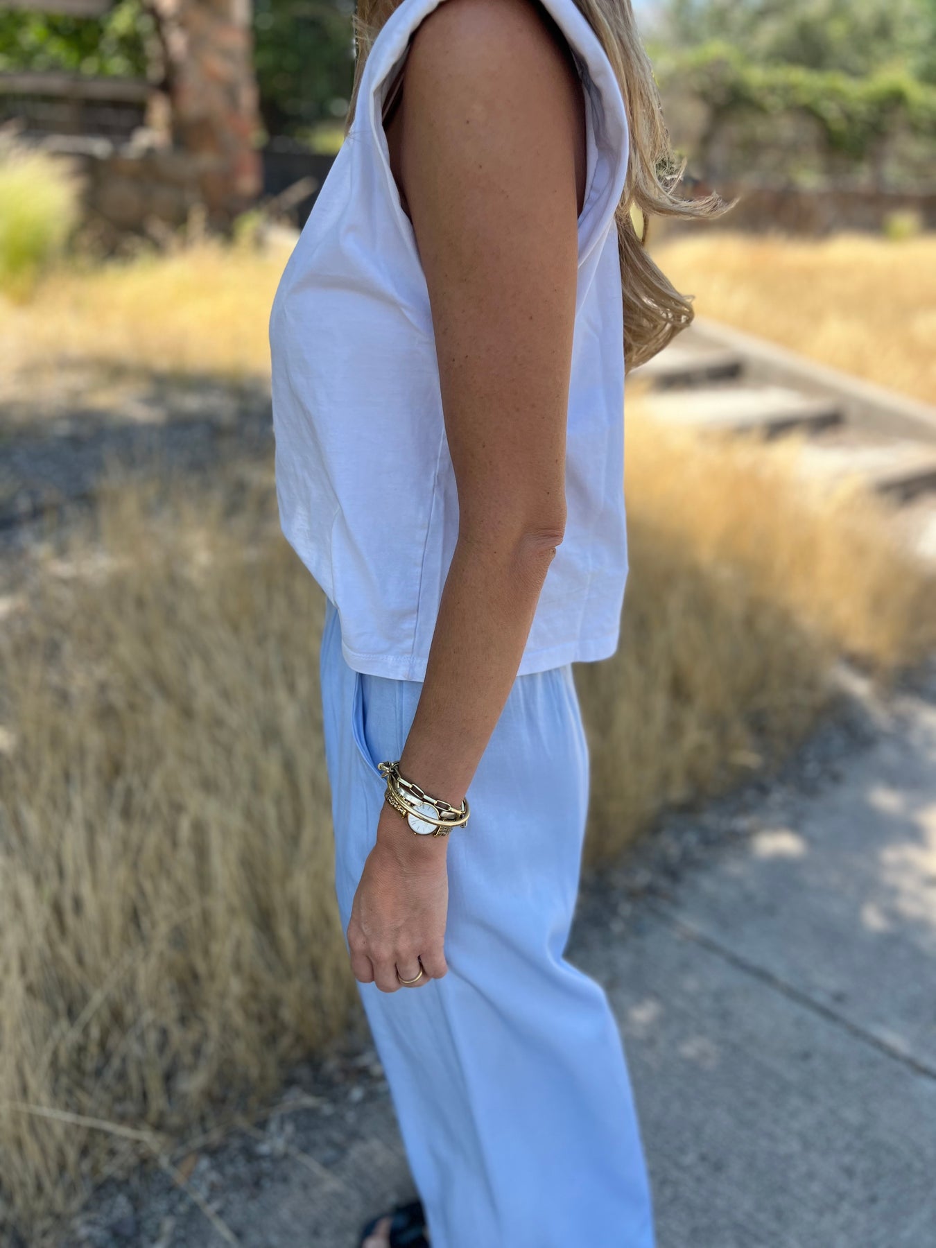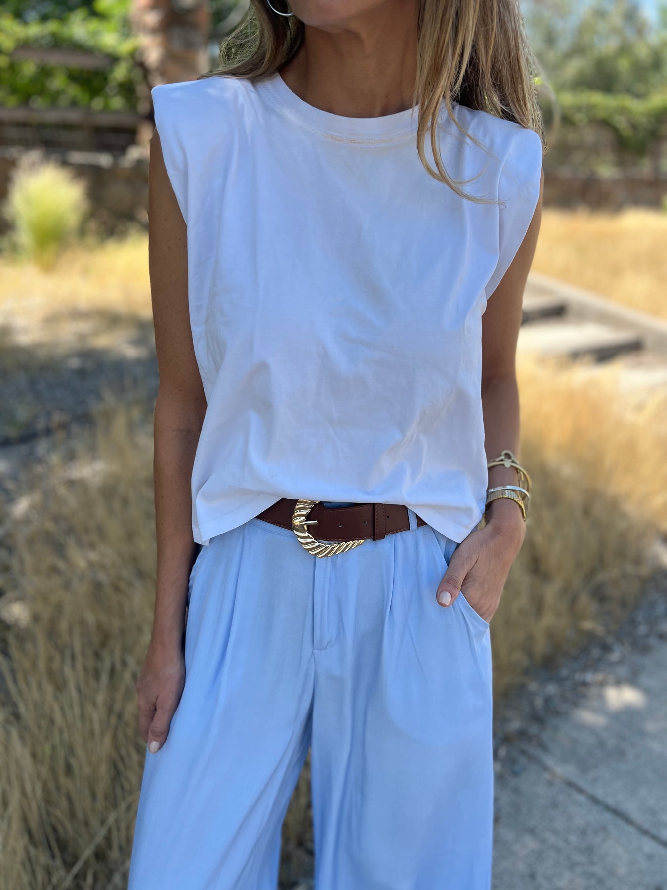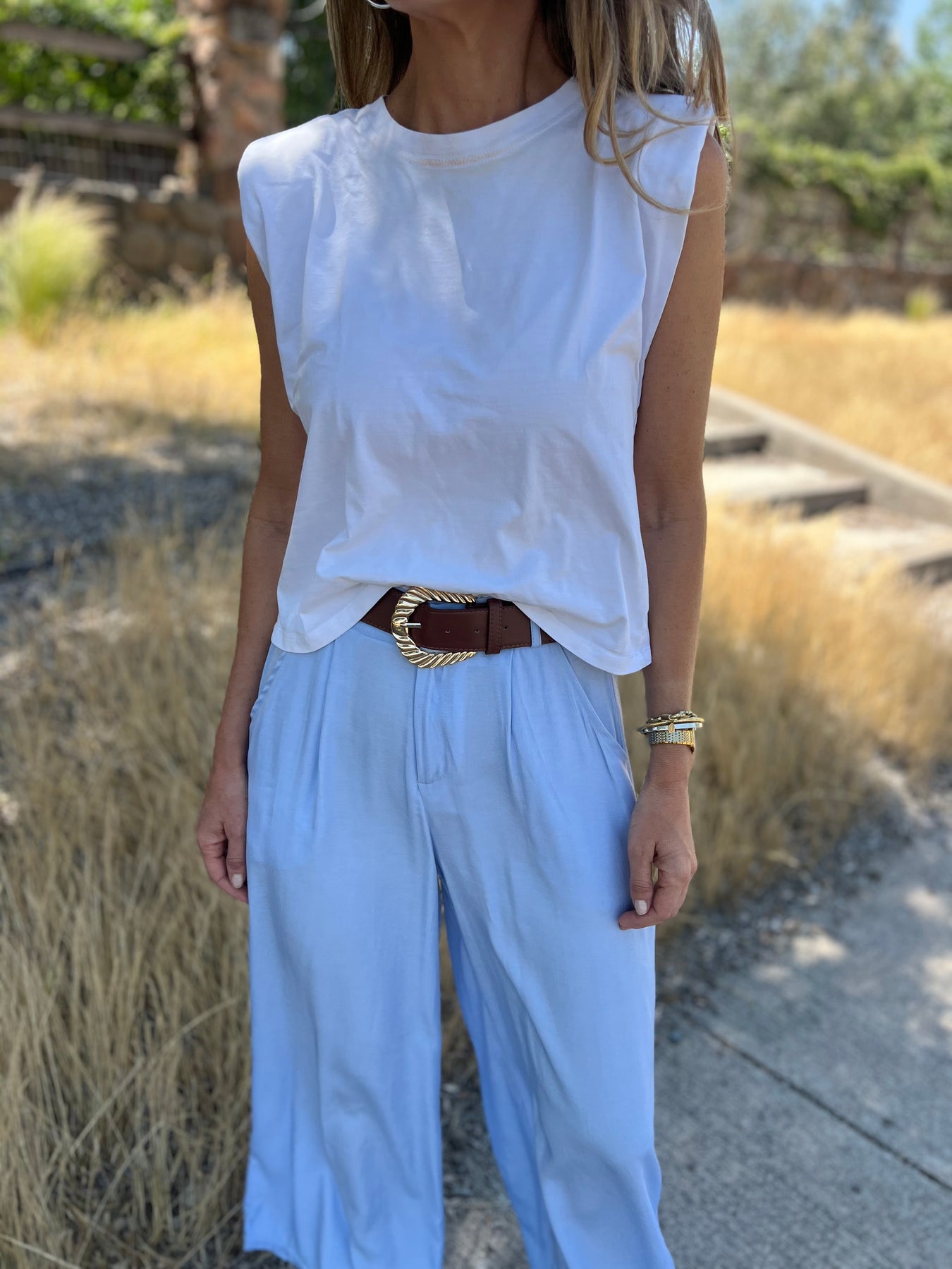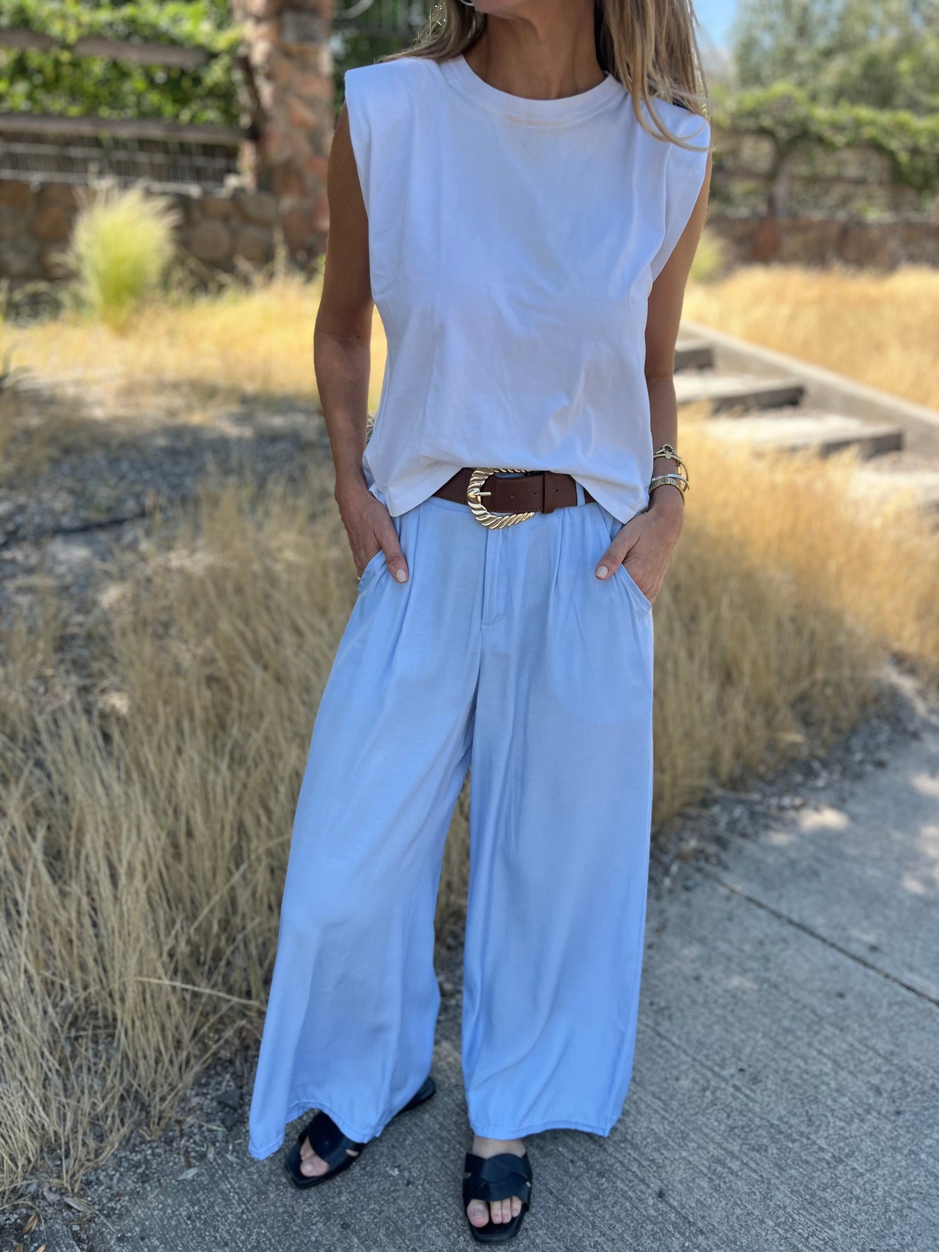 Pantalón de tencel. Incluye cinturón de ecocuero. Efecto semi tornasol.