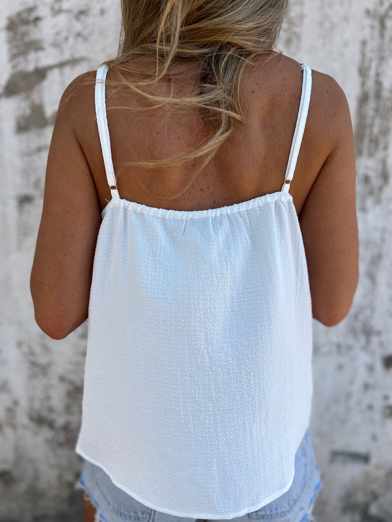 Polera de creo delgado que no se trasluce nada con tiritas que ajustan el largo. Encaje en escote. Espalda elasticada