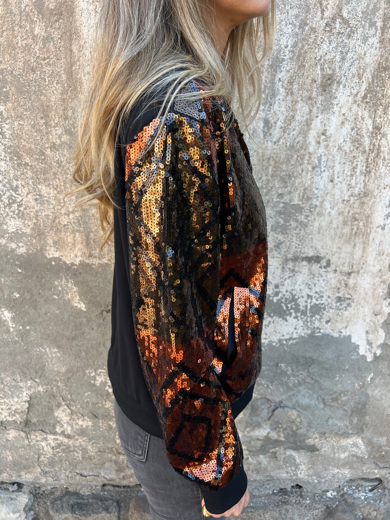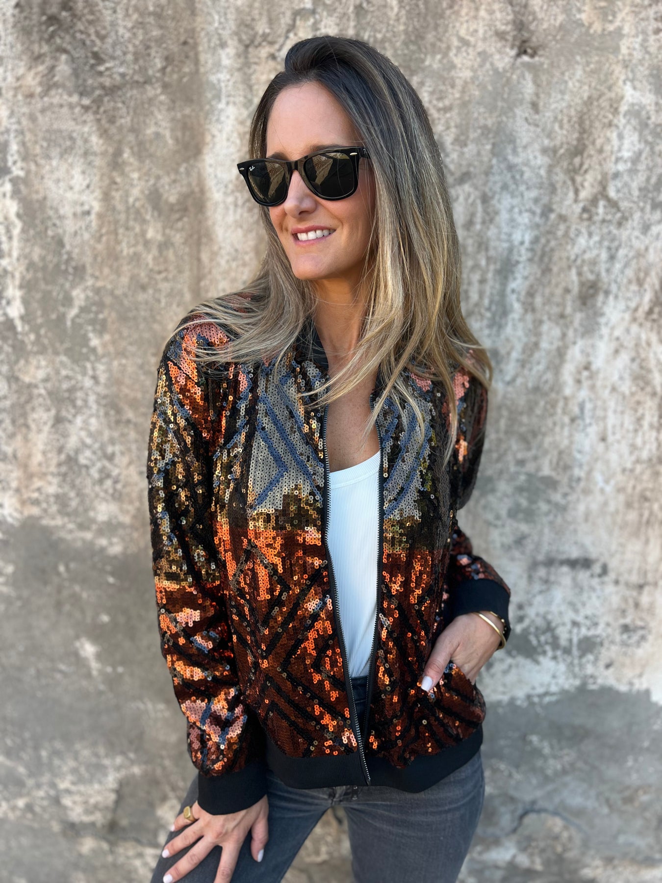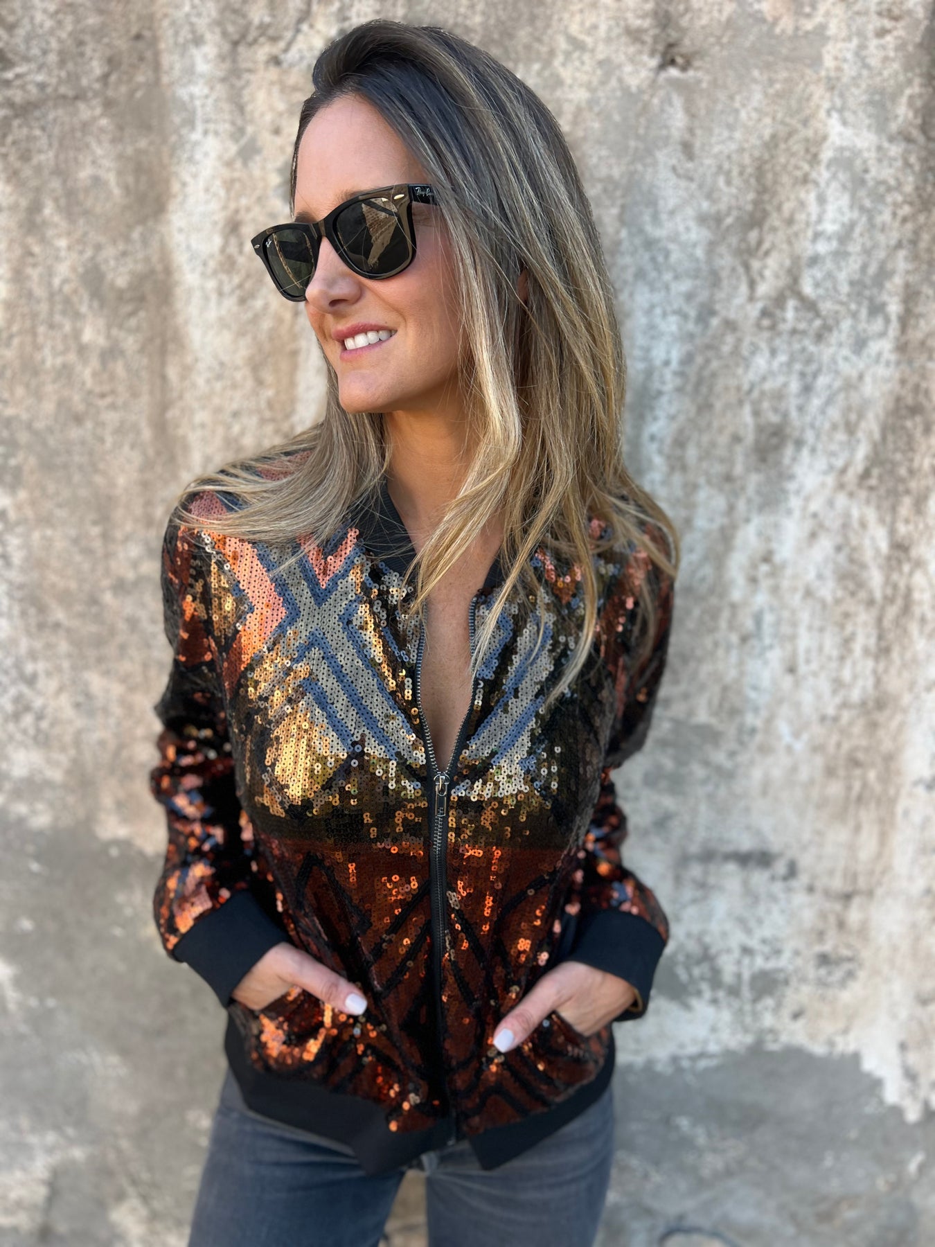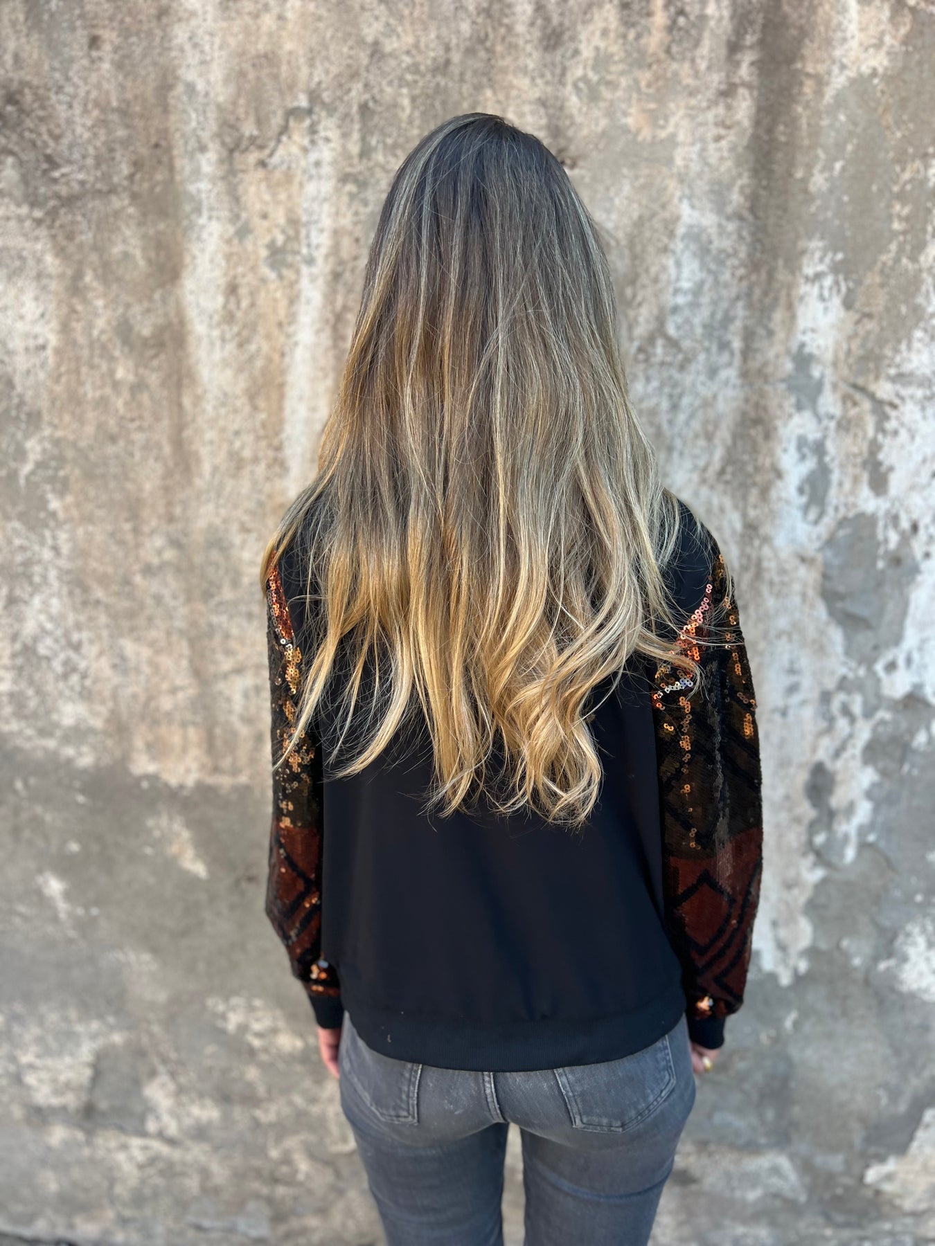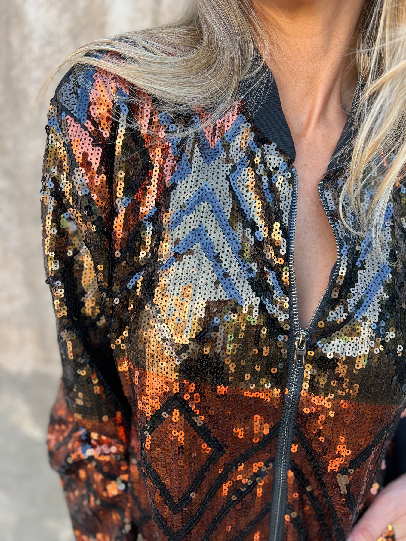 Bomber de lentejuelas bordadas. Forrada. Parte de atrás de tull y cierre. Pretina elasticada.