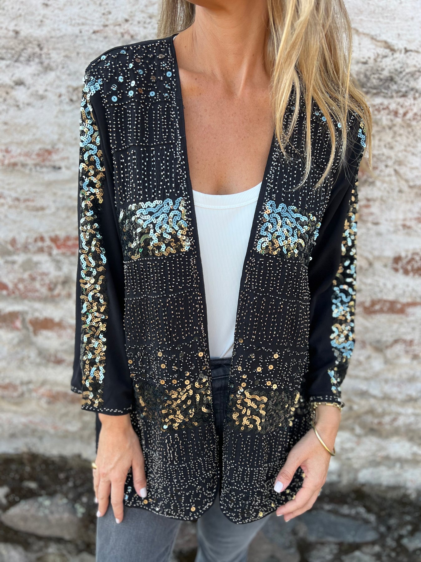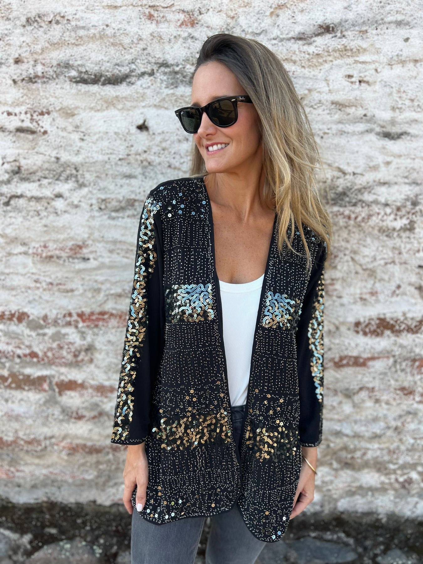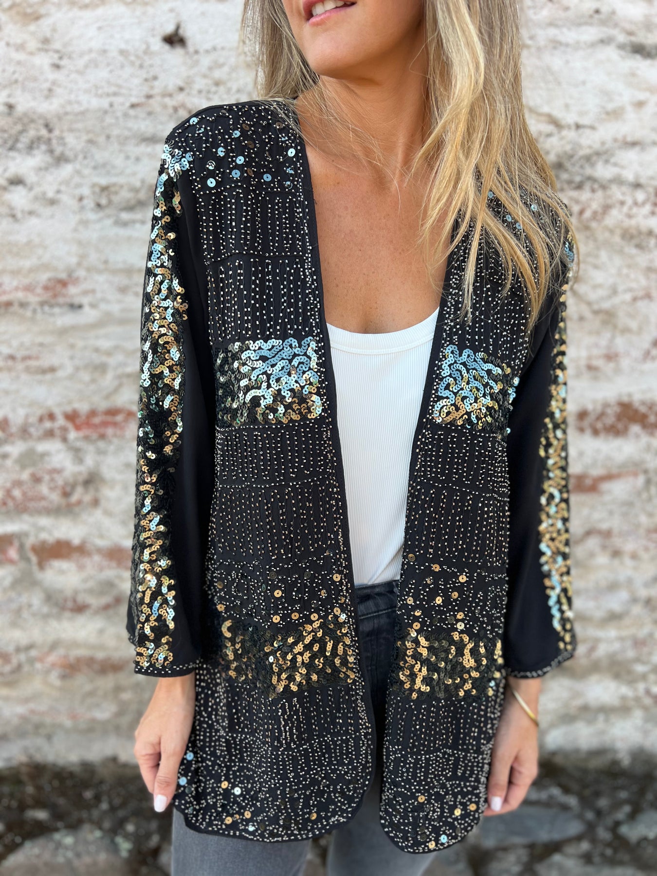 Bomber de lentejuelas bordadas. Forrada. Parte de atrás de tull y cierre. Pretina elasticada.