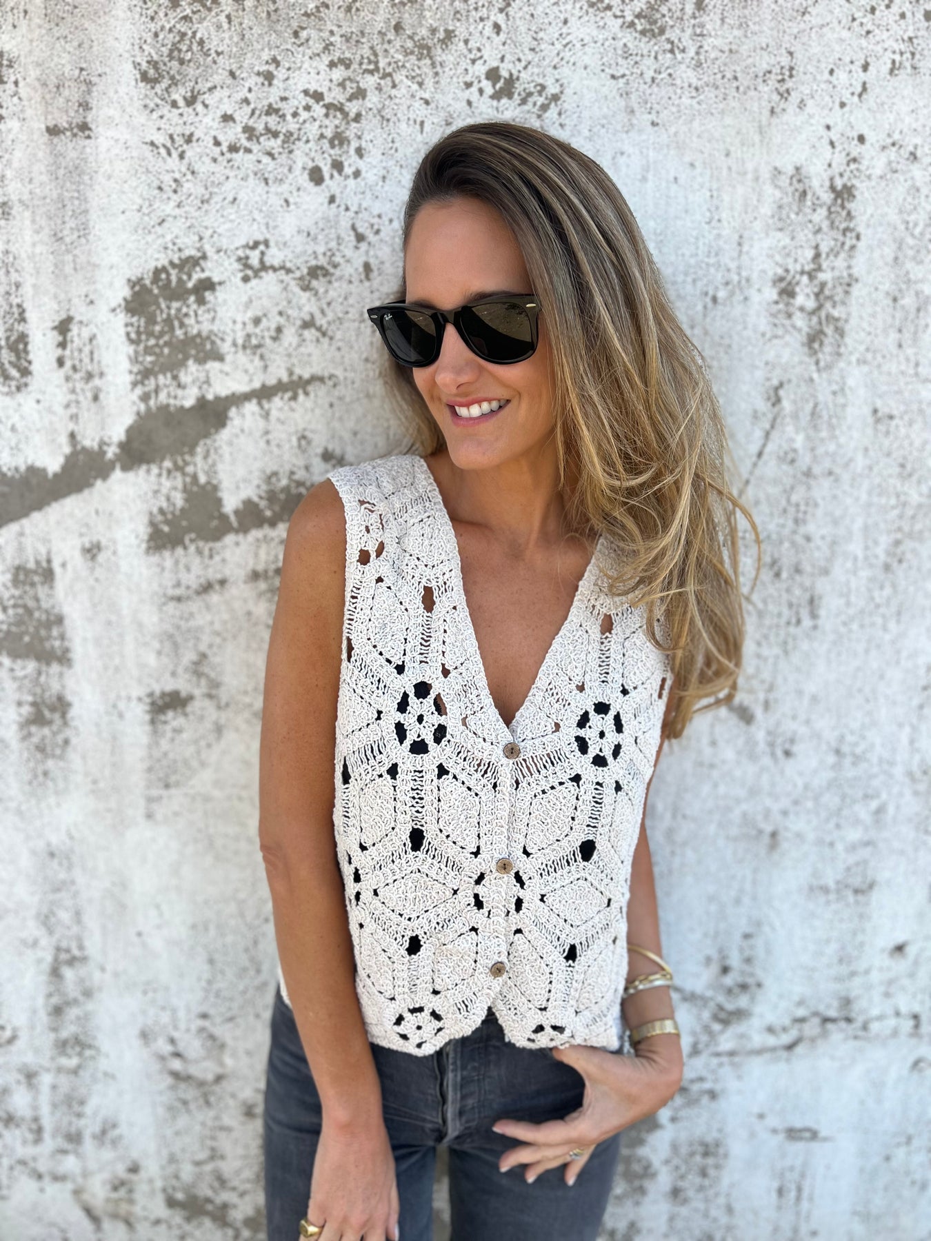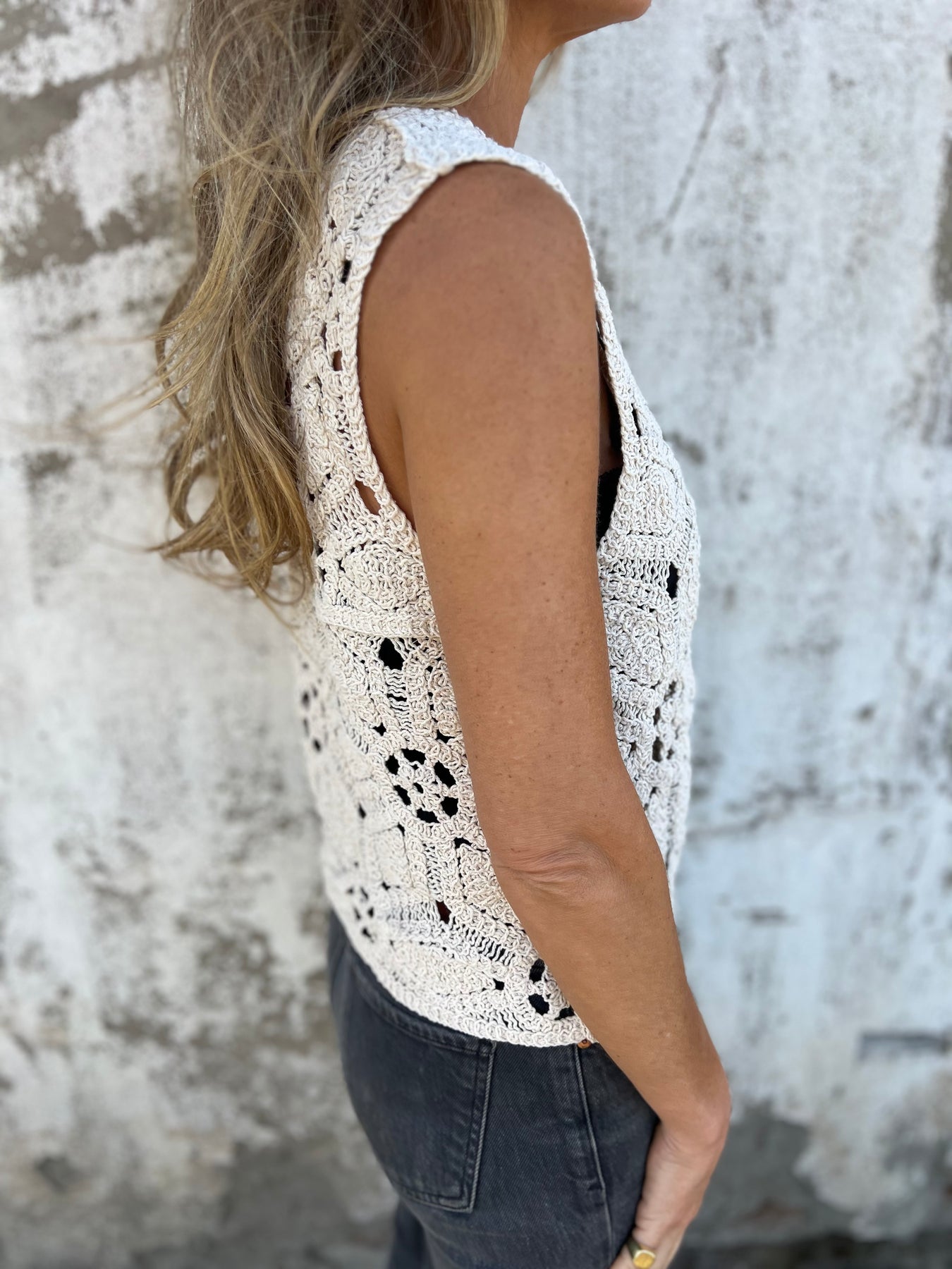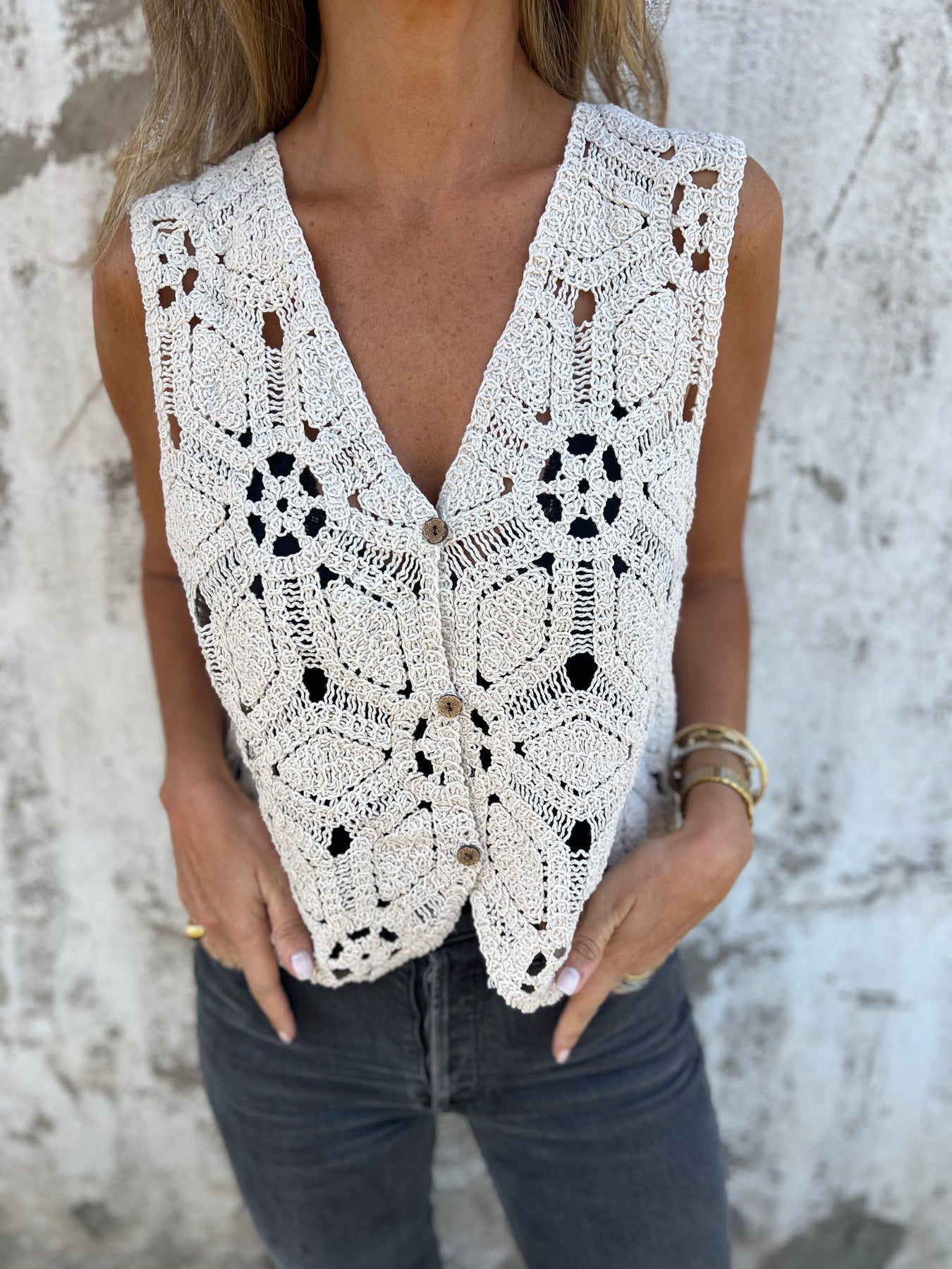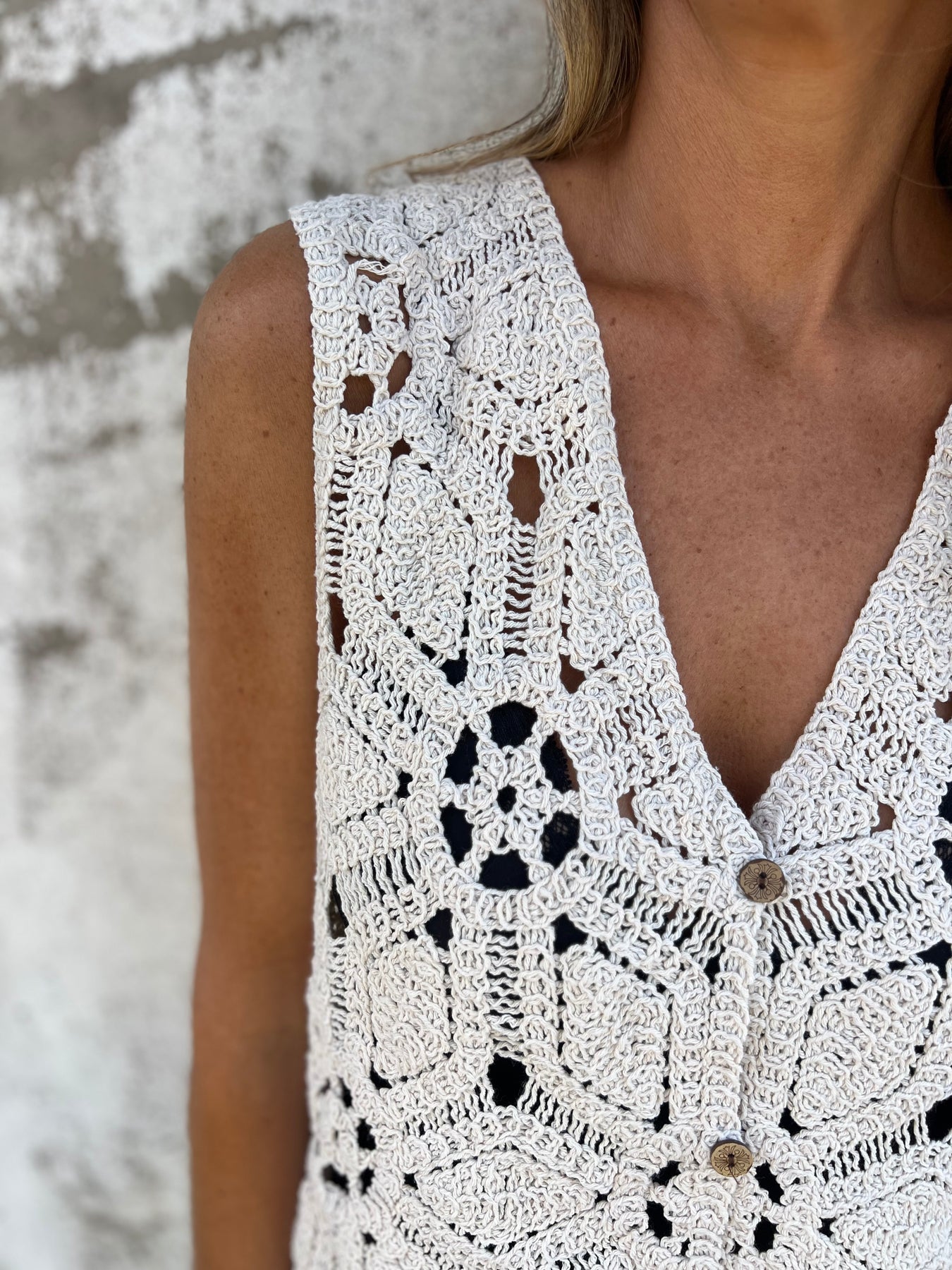 Gillette de macramé con botones de madera