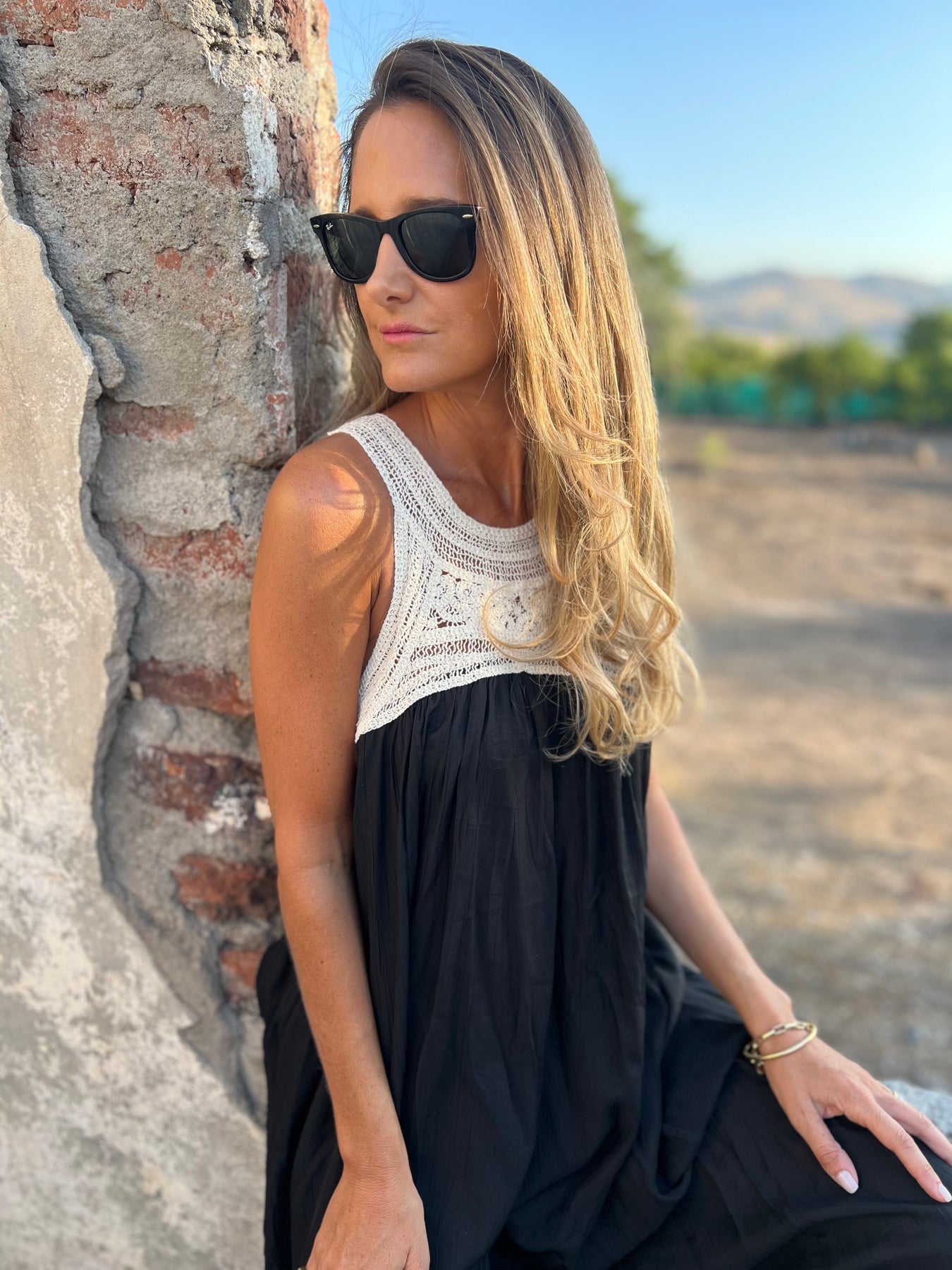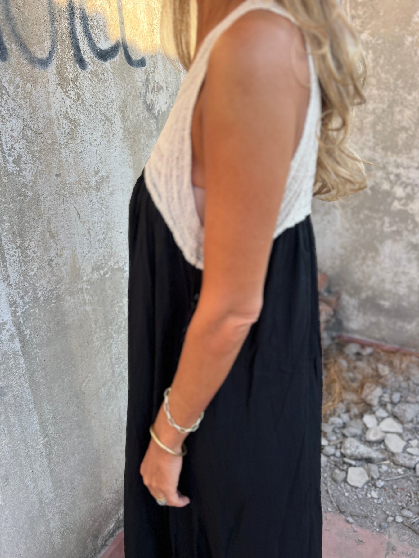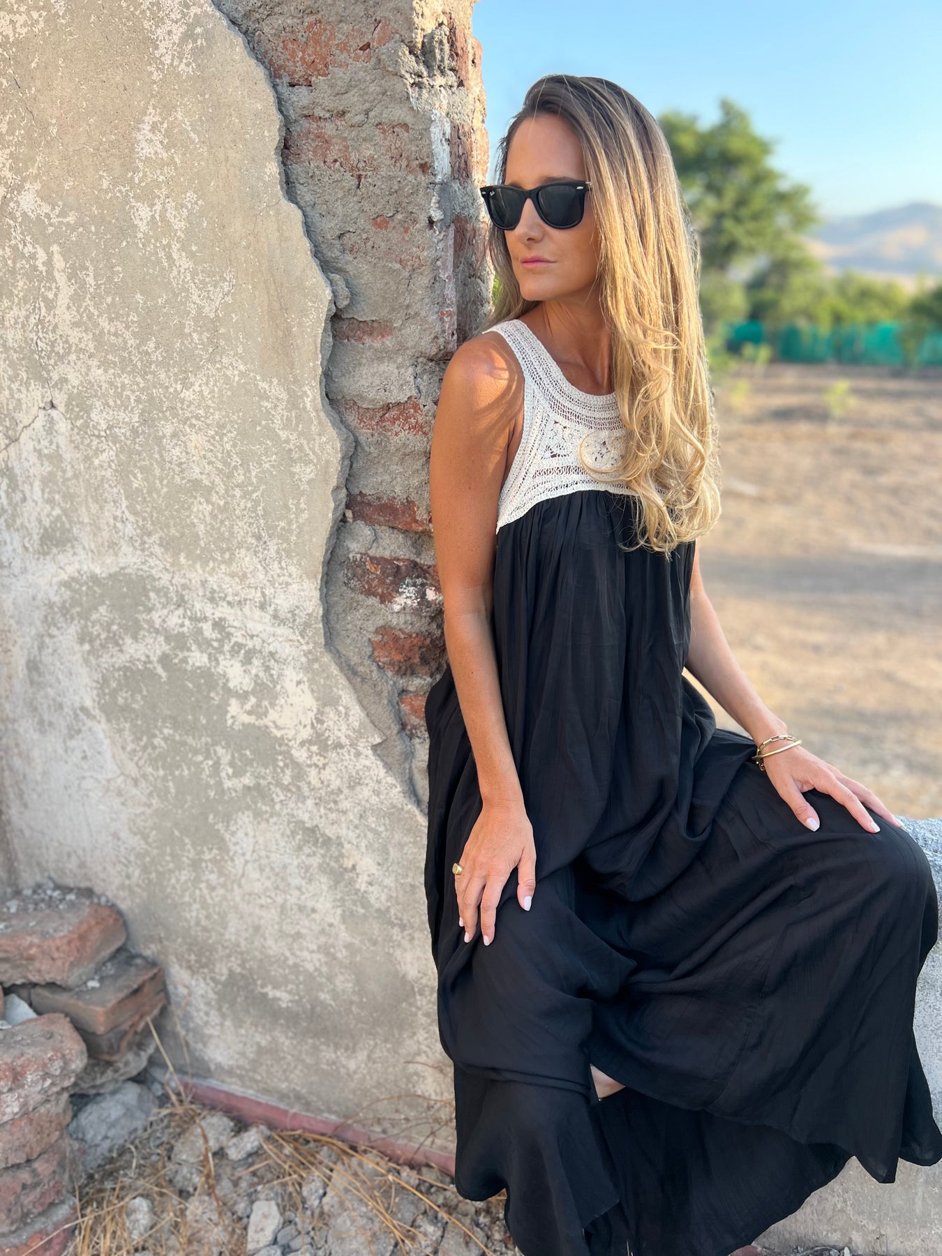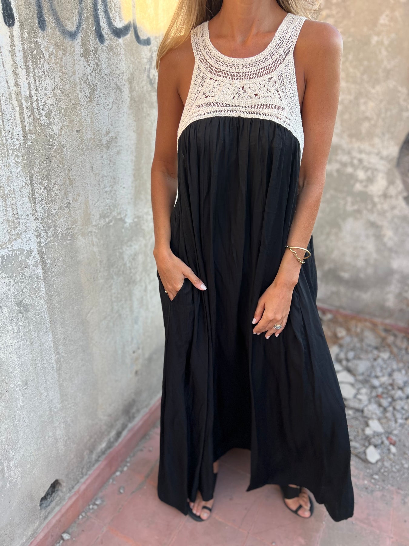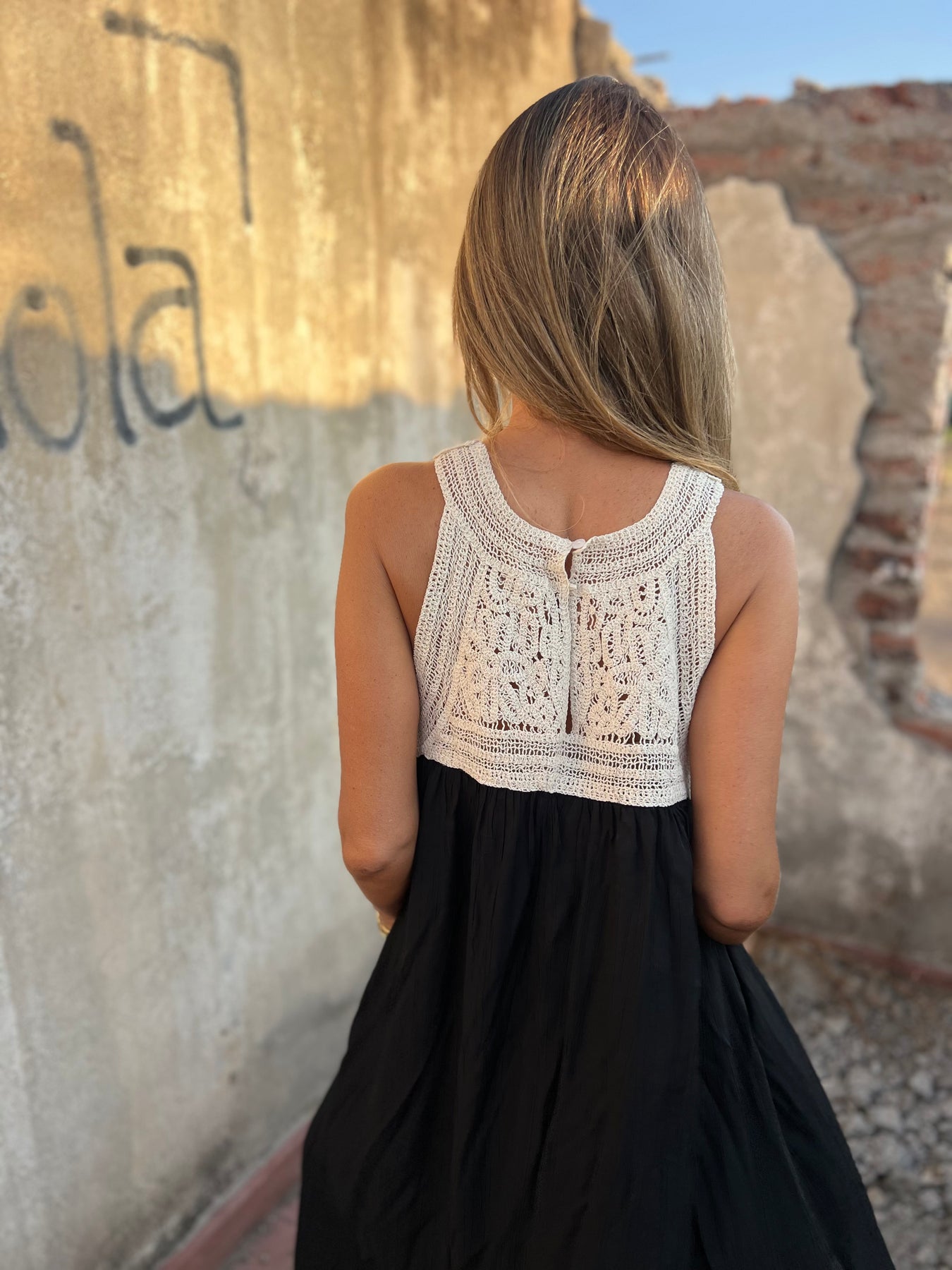 Vestido de fibra de seda opaca contorno detalle de crochet.