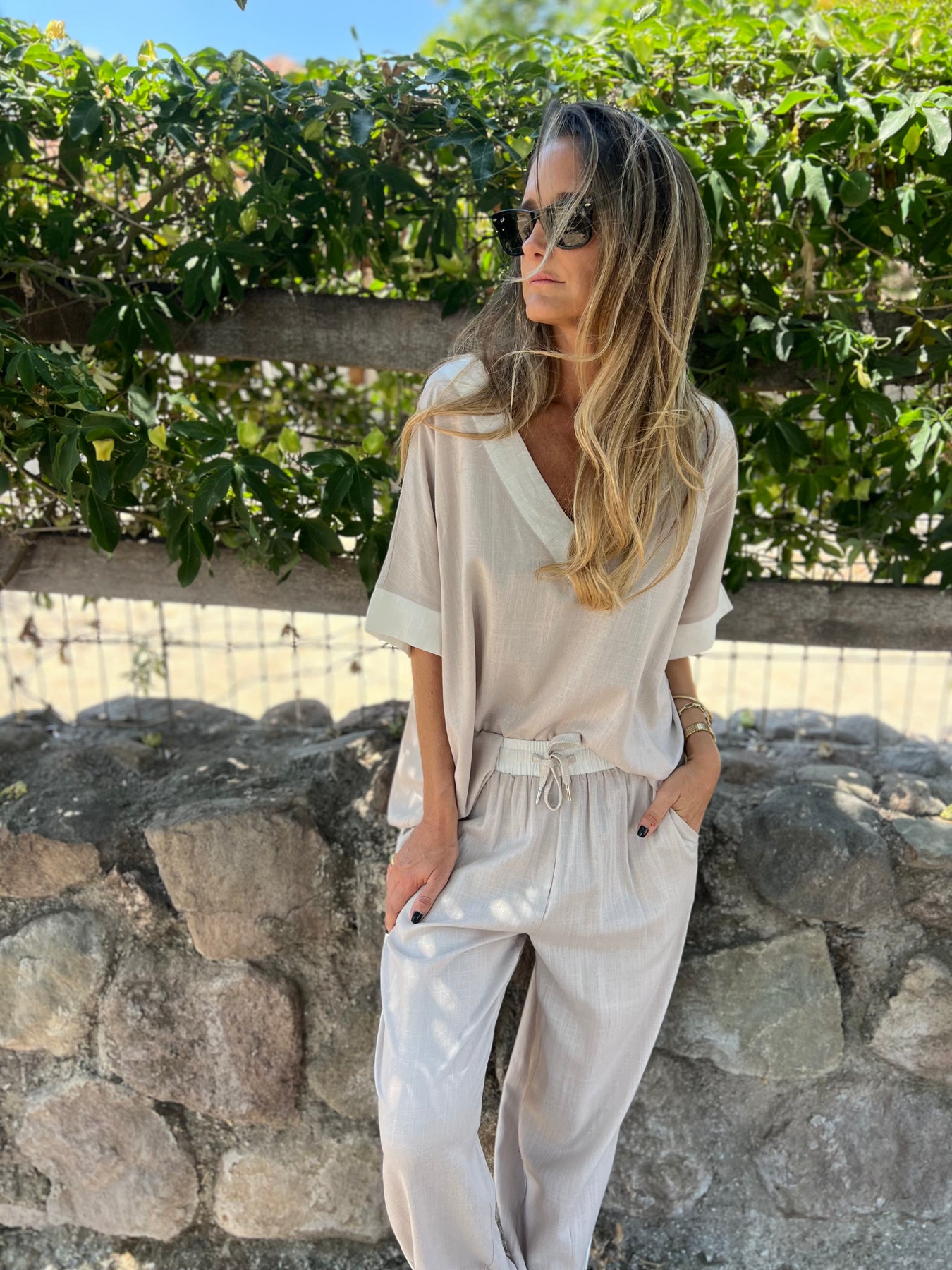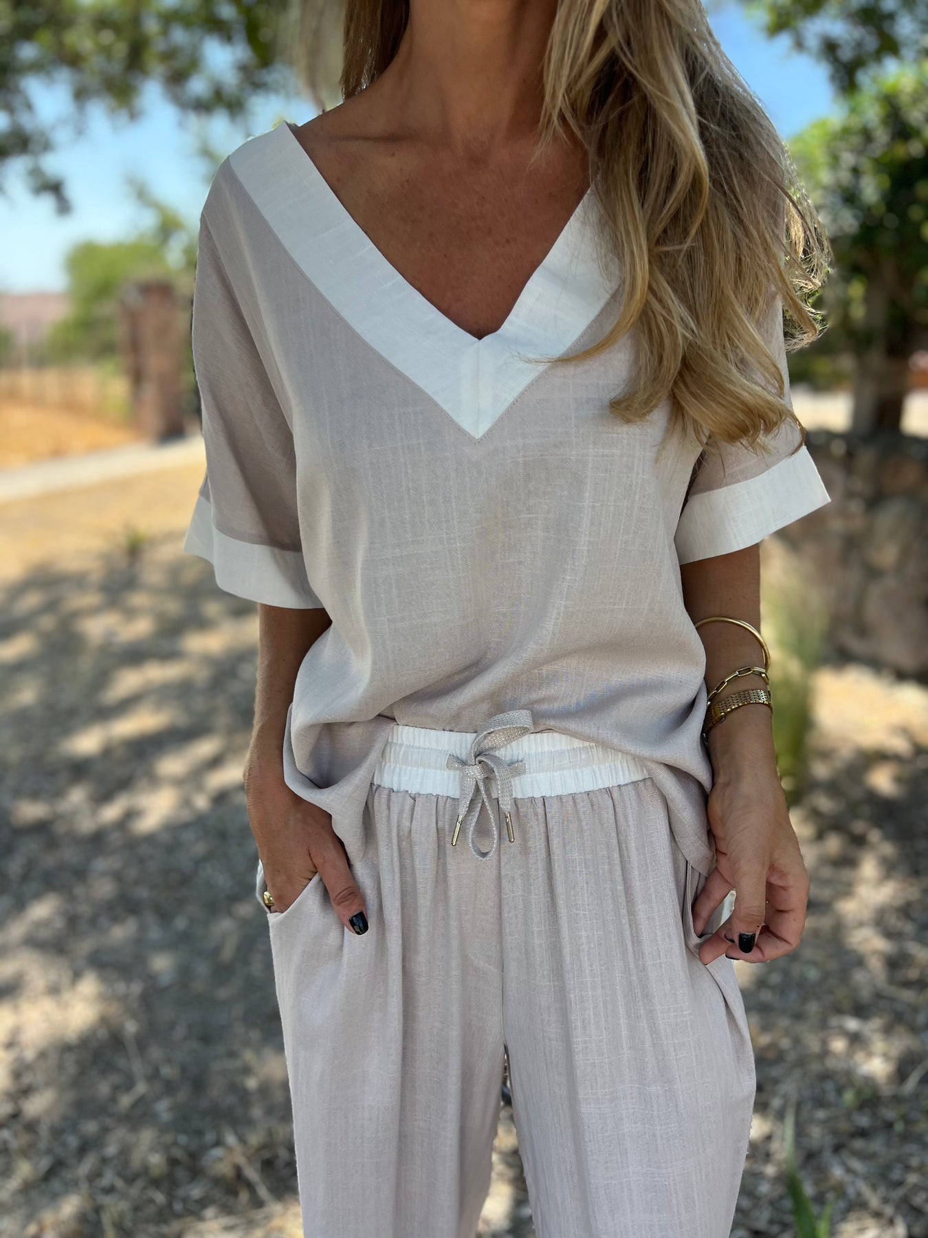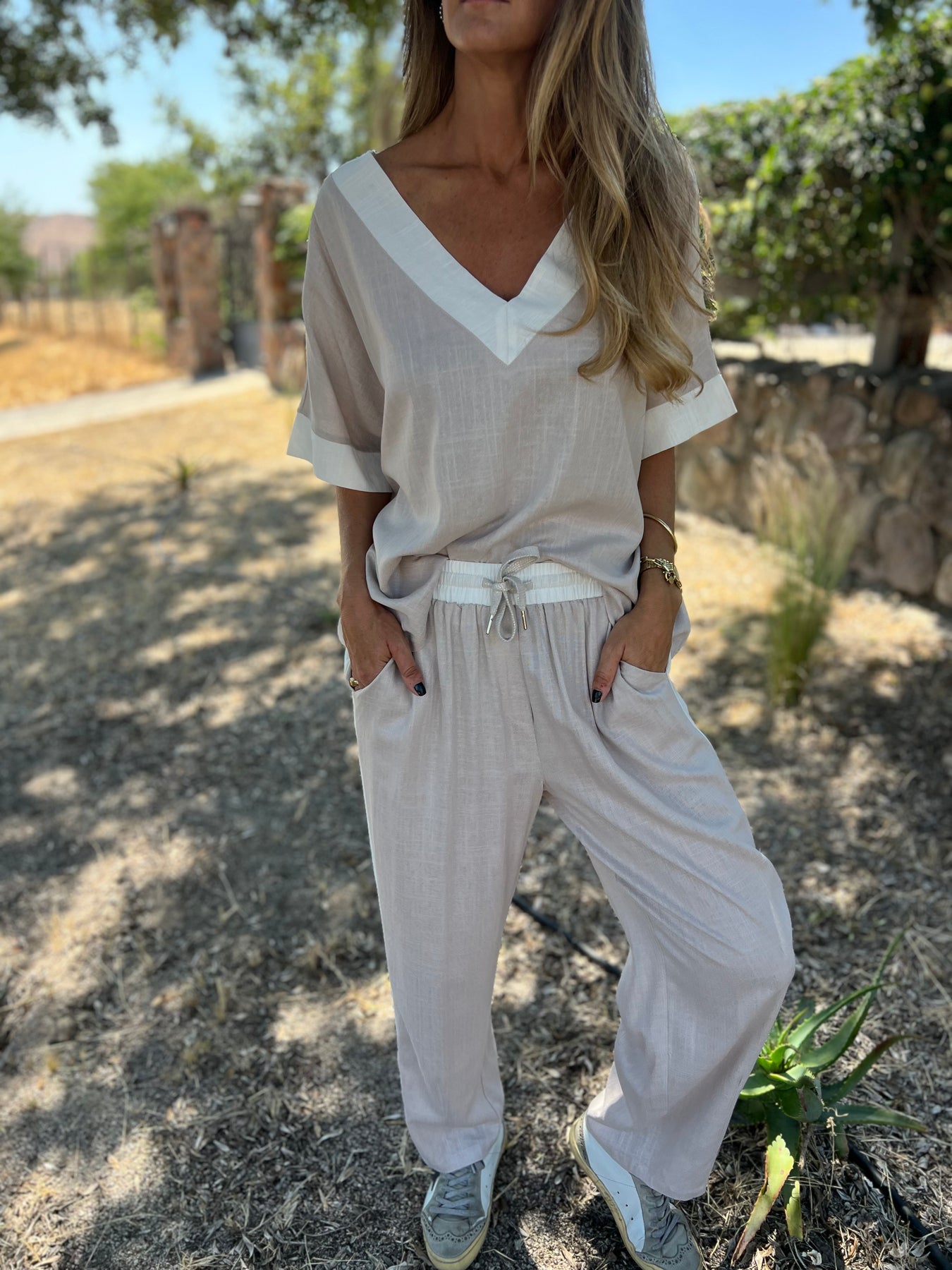 Pantalon de linoto delgado con brillos sutiles y cintura elasticada y bolsillos.