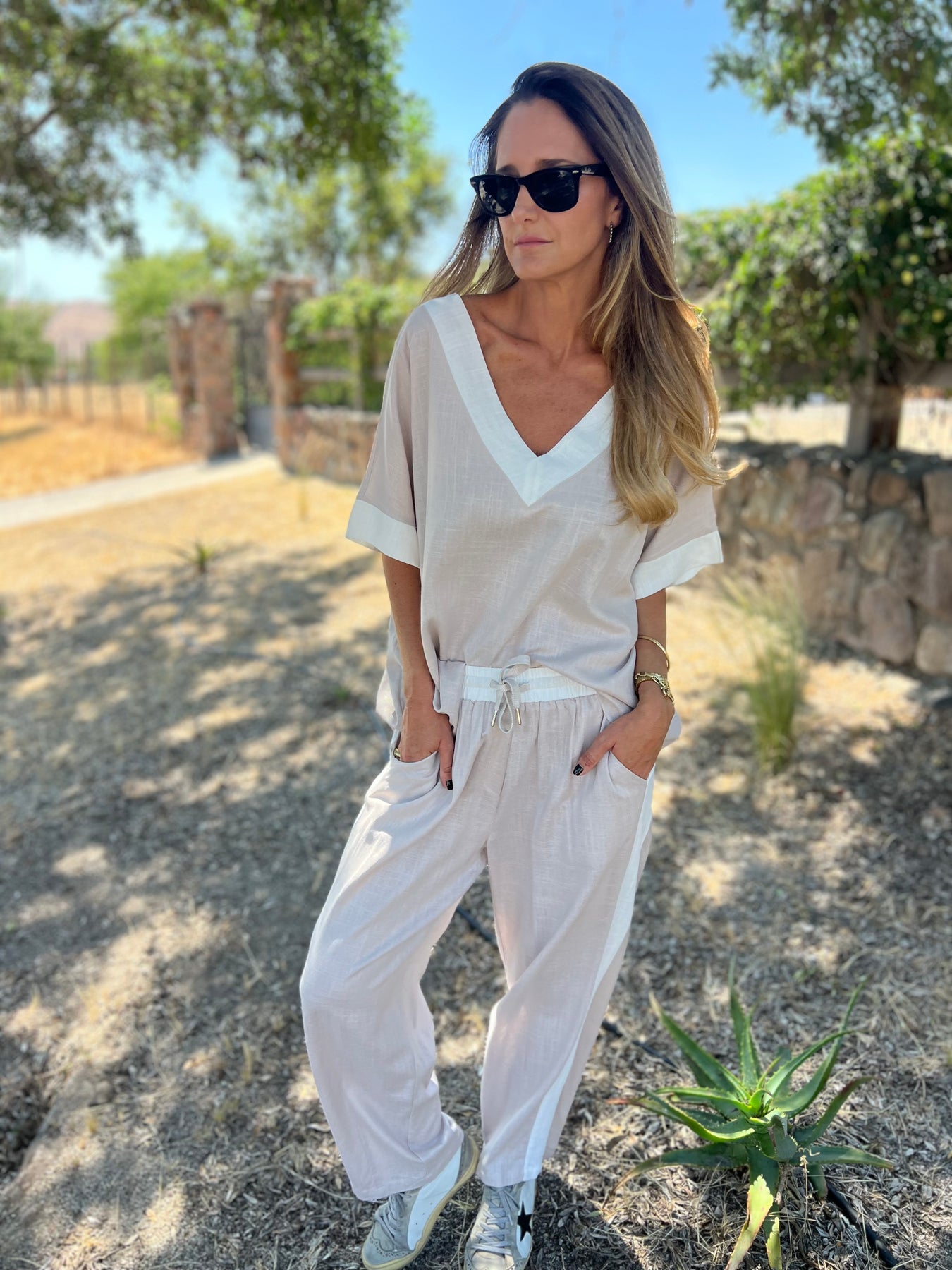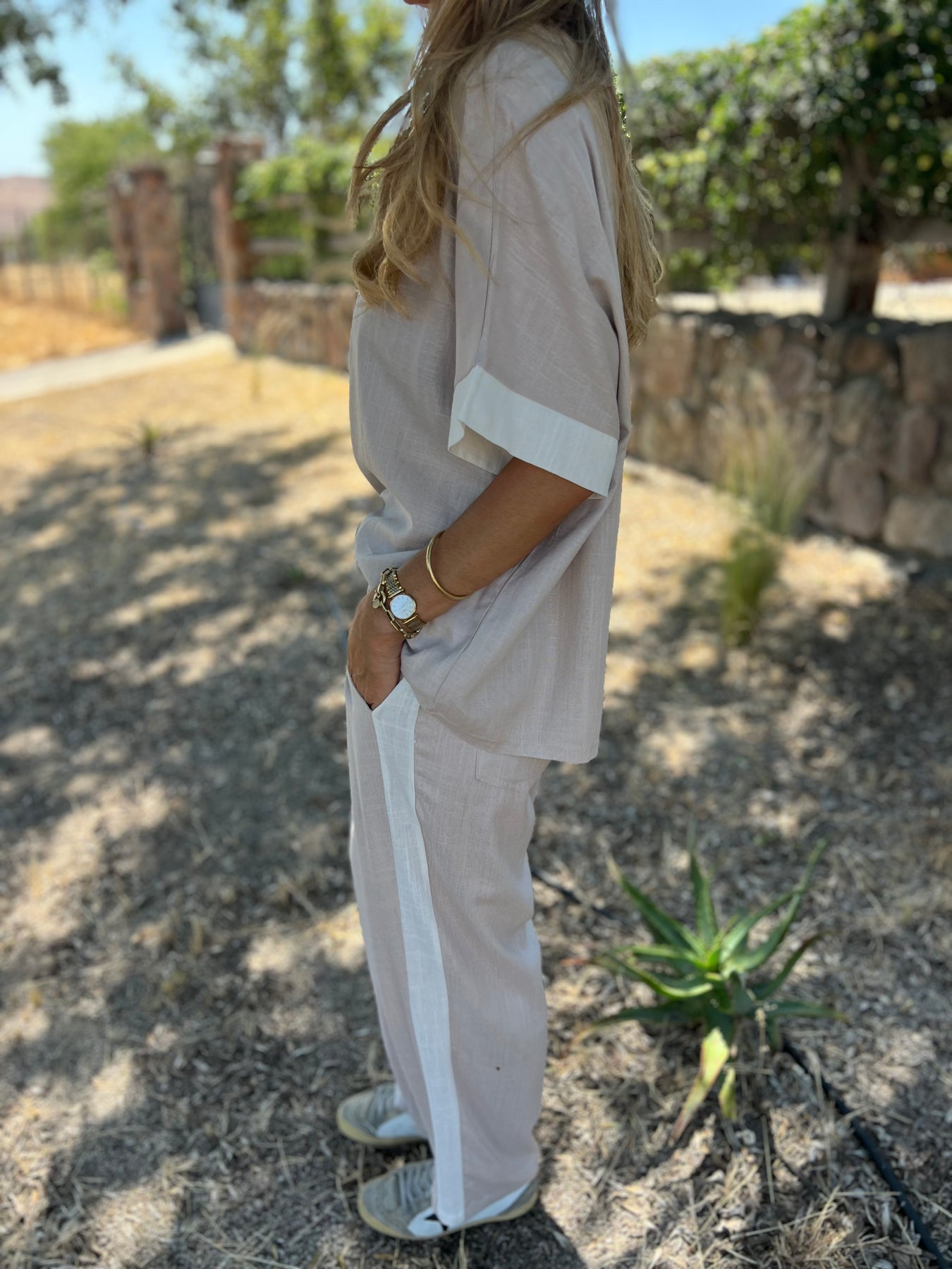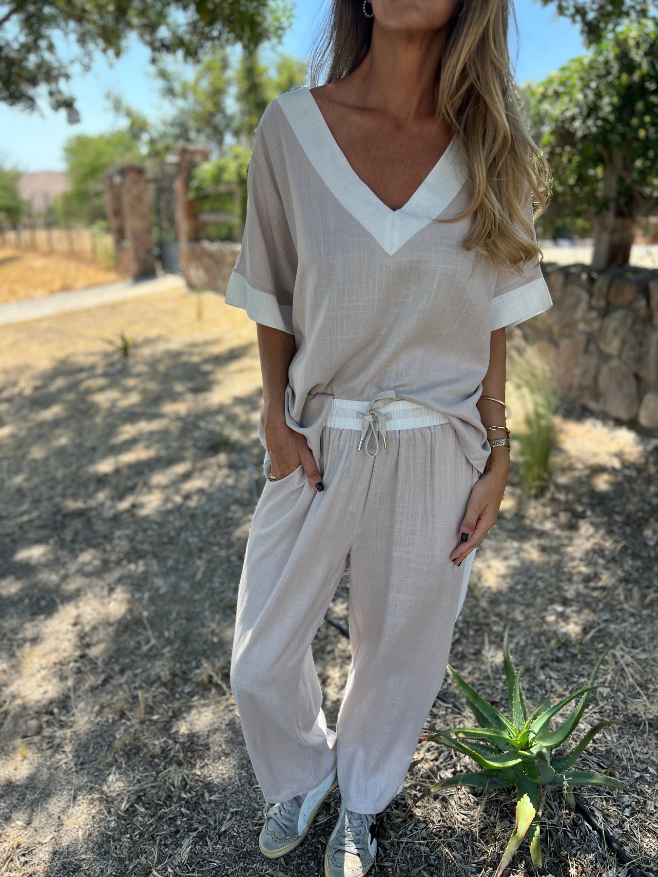 Pantalon de linoto delgado con brillos sutiles y cintura elasticada y bolsillos.