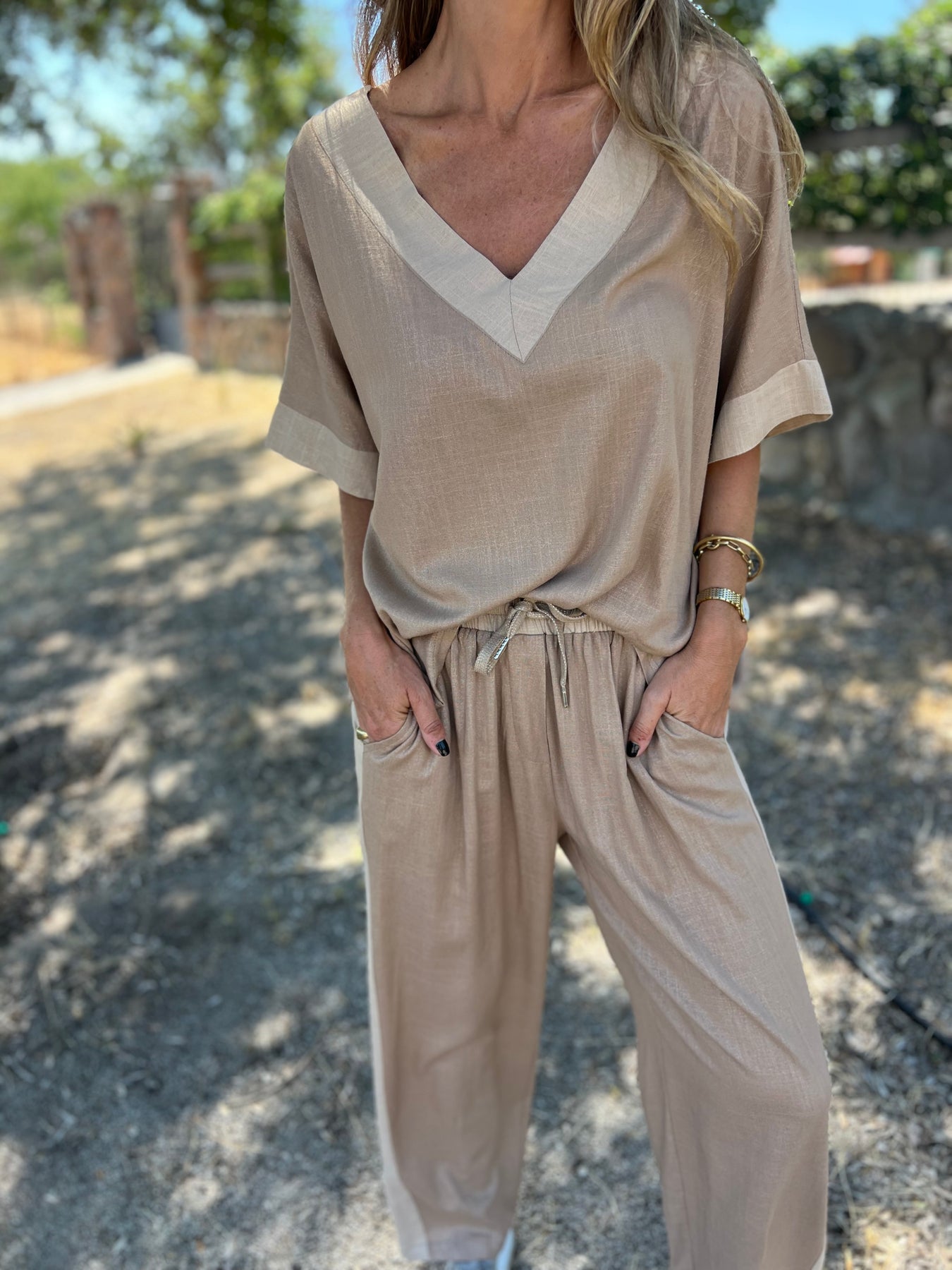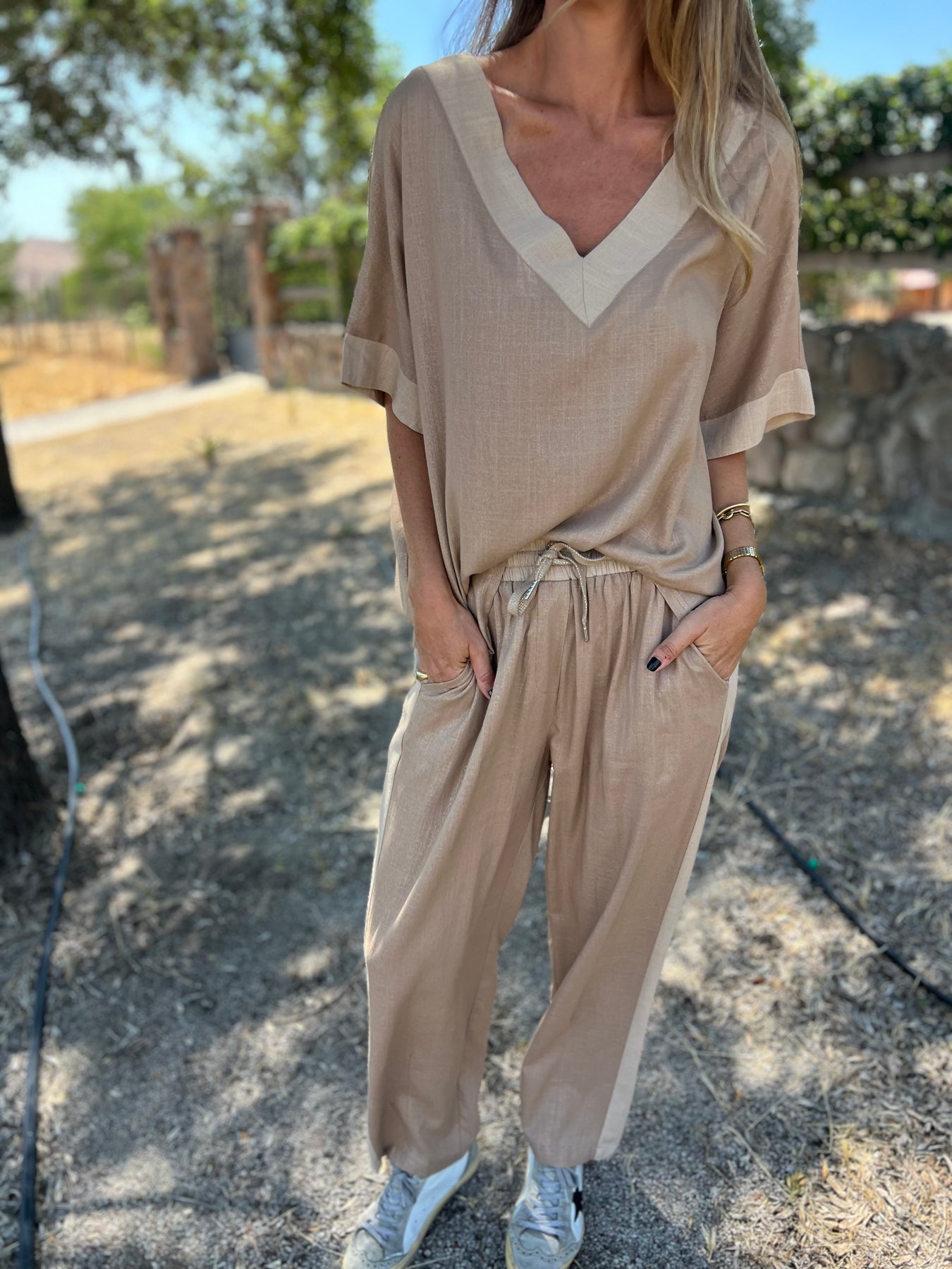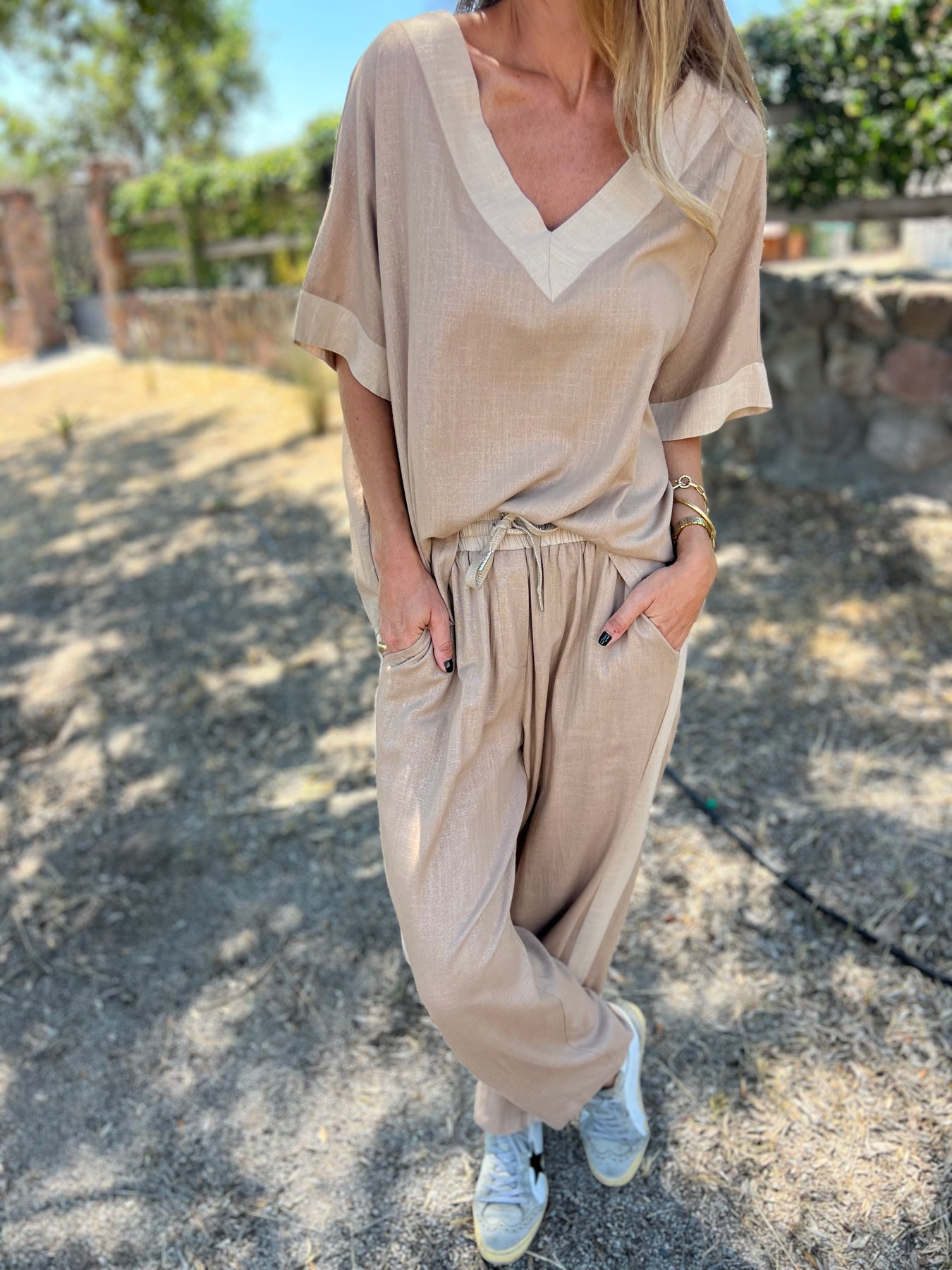 Pantalon de linoto delgado con brillos sutiles y cintura elasticada y bolsillos.