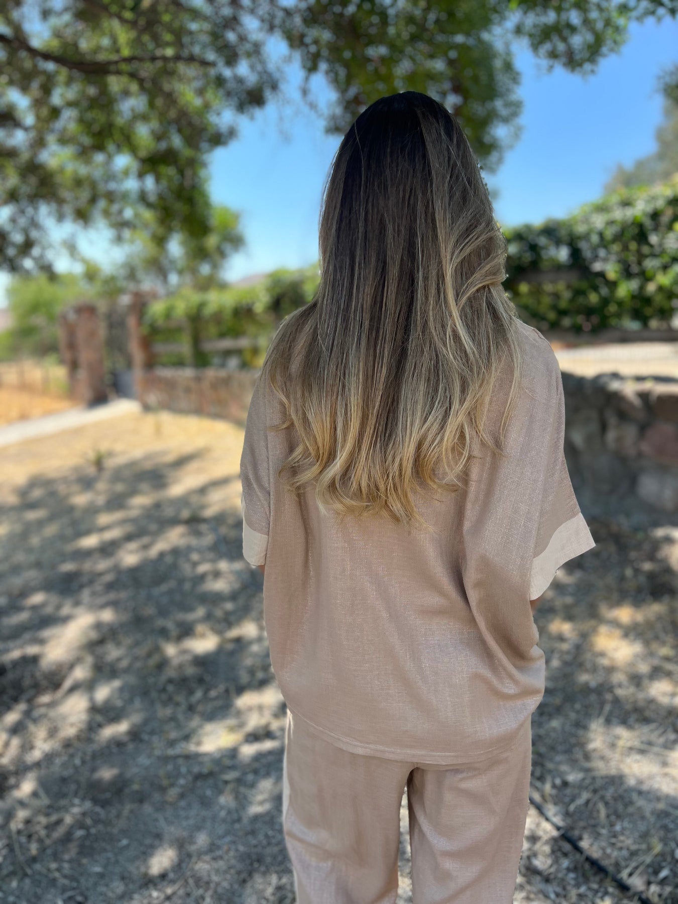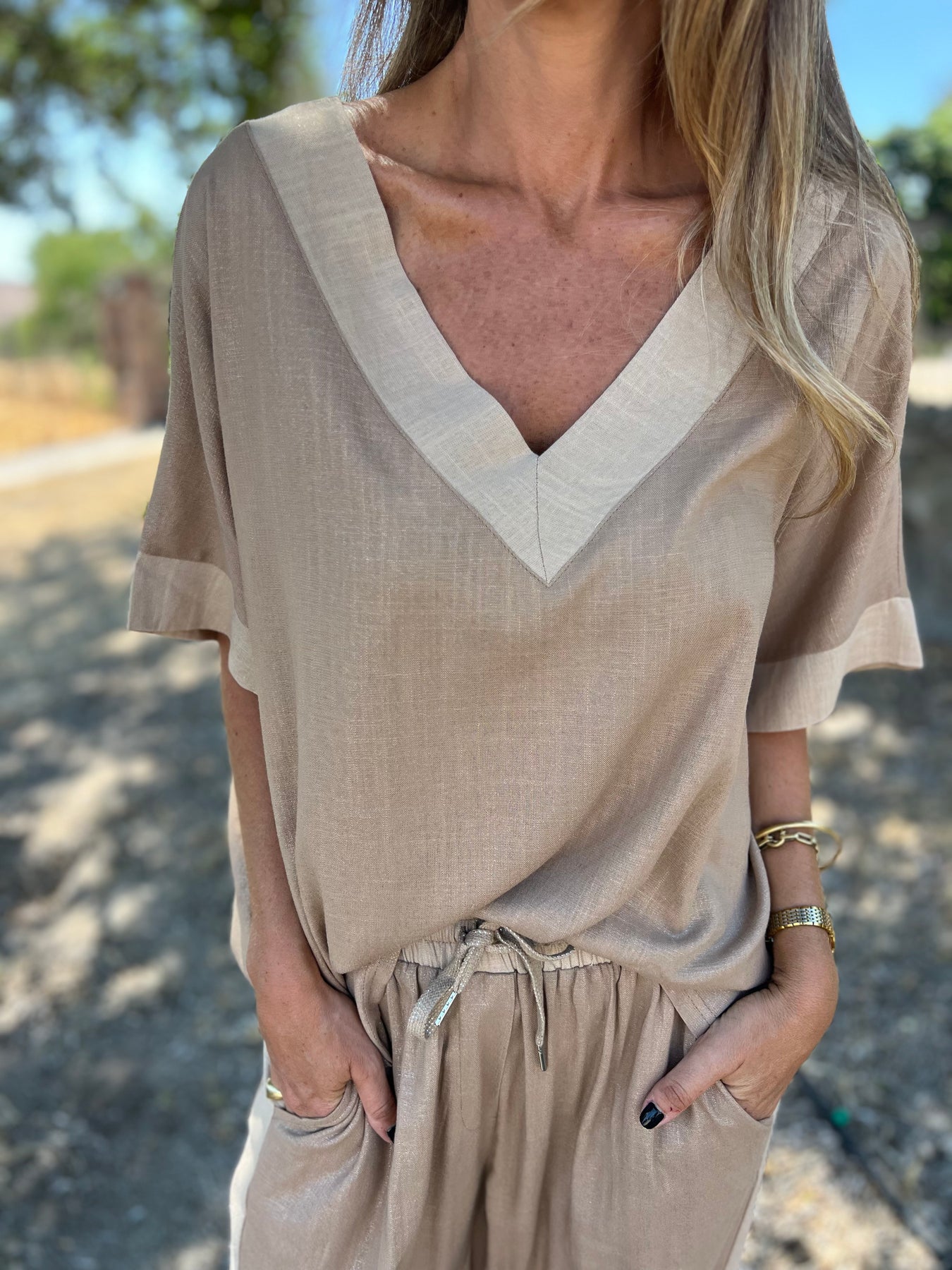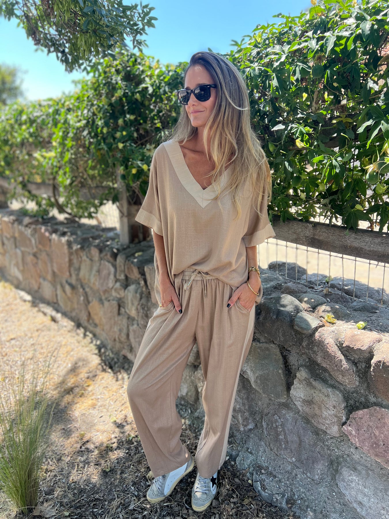 Pantalon de linoto delgado con brillos sutiles y cintura elasticada y bolsillos.